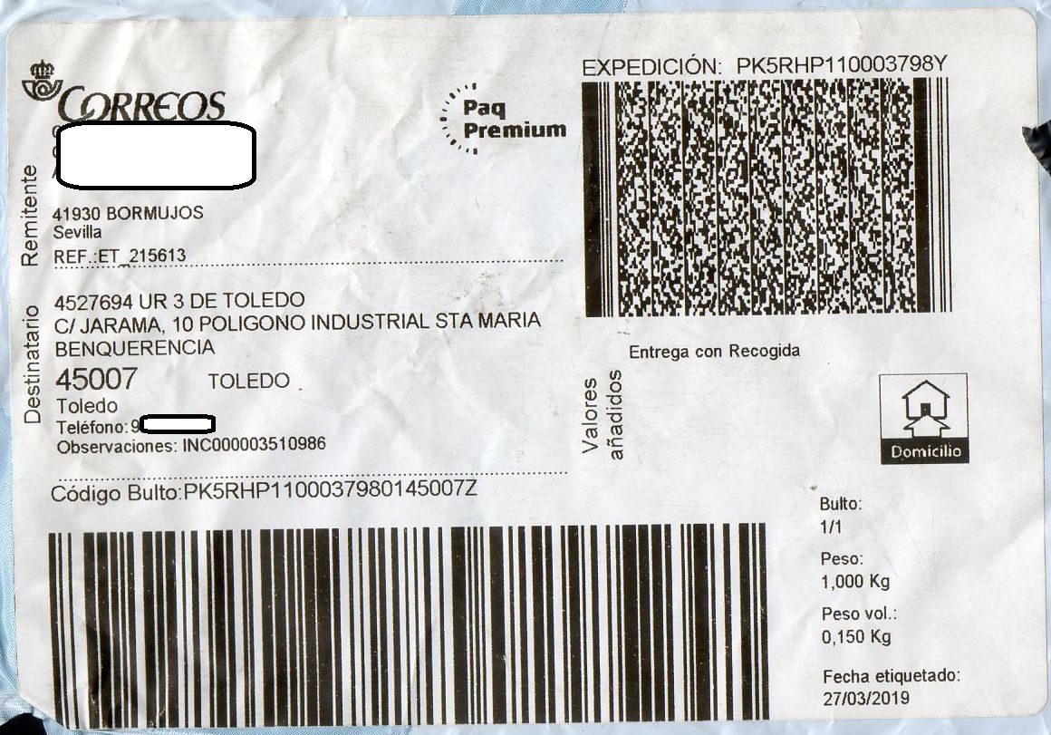 Otra, con el logotipo nuevo de Correos y una forma distinta de especificar el tipo del envío: