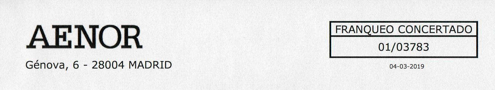 Creo que AENOR tiene mas de un nº de autorización. Solo tengo ese impreso :? Además voy a mostrar también el reverso. FRANQUEO CONCERTADO 01/03783