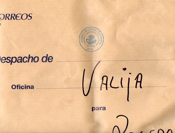 El sobre donde se estampa la marca administrativa de Correos de la OFICINA PRINCIPAL DE TOLEDO ZONA 7, está destrozado...asi que de momento tenemos que conformarnos con el tampón de dicha marca: