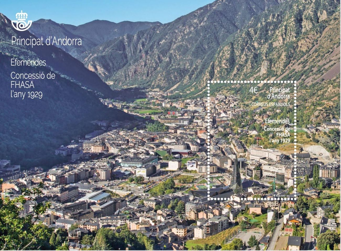 Dios mediante, el día 31 de mayo de 2019 se pondrá en circulación una hoja bloque con un sello de correo correspondientes a la serie del Principado de Andorra «Efemèrides», denominados «Concessió de FHASA, l’any 1929».