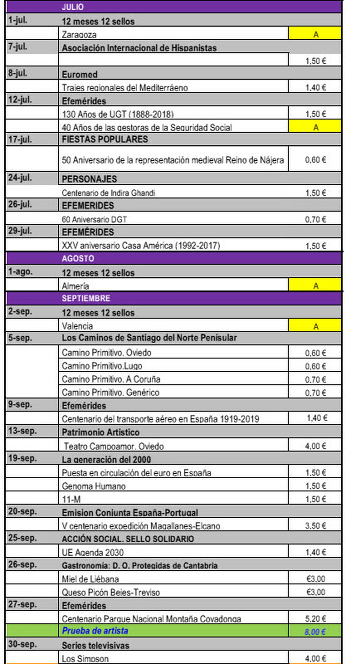 Correos ha actualizado el programa de emisiones previsto para todo el año 2019.