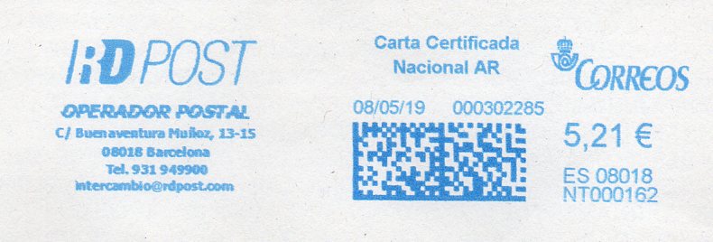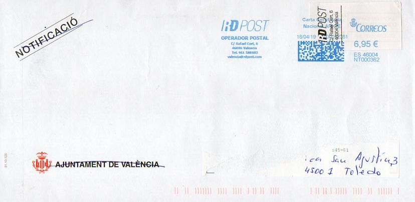 Aunque no lo indica, el ayuntamiento de Valencia también se encuentran entre sus clientes y es posible que por la etiquetilla con el RDPOST de valencia, dispongan de franqueadora también allí.Azul531.jpg