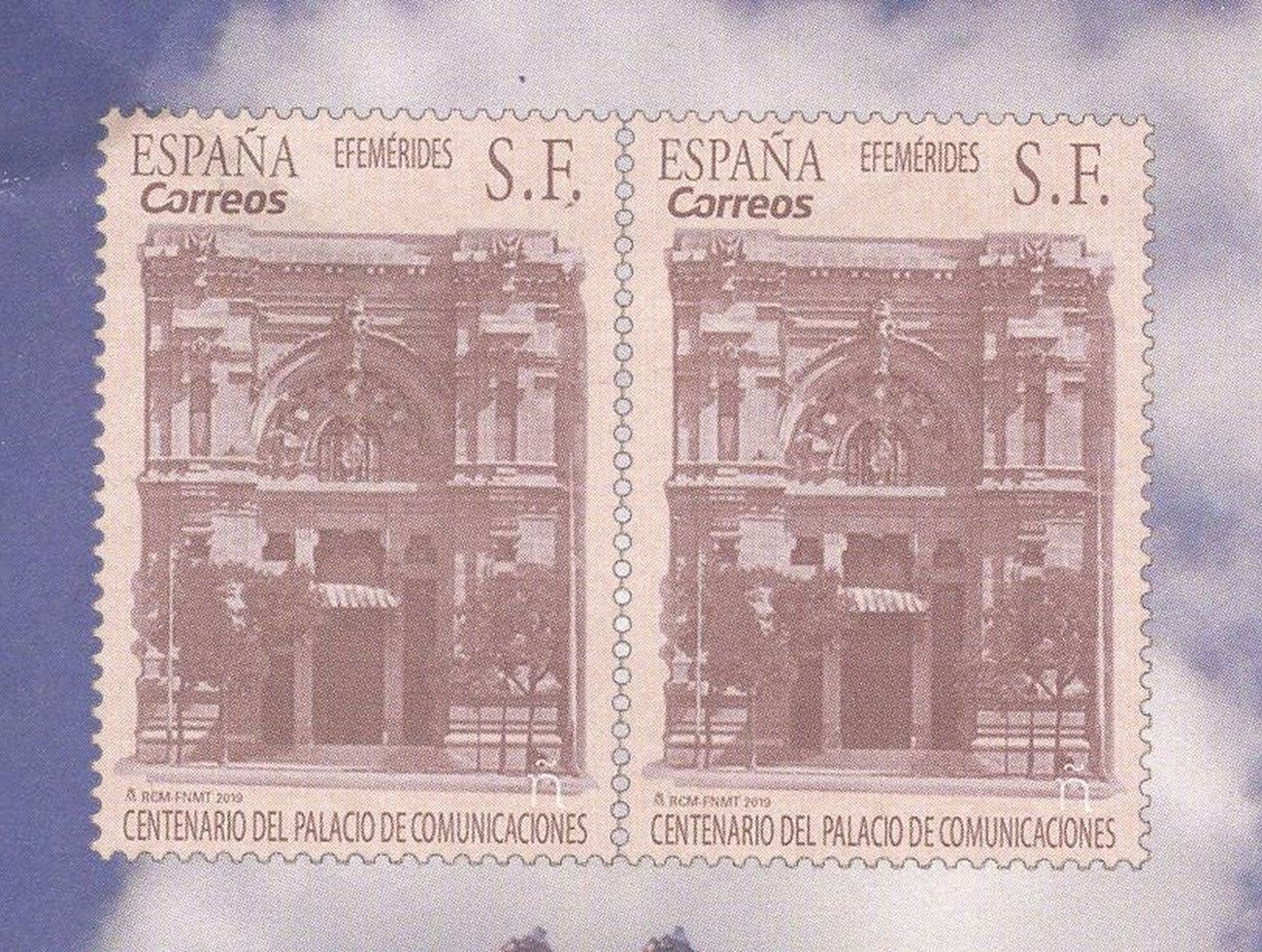 En este ocasión se publicita, de forma doble, el sello del Centenario del Palacio de Comunicaciones que se emitió, en forma de hoja bloque, el pasado 14 de junio.