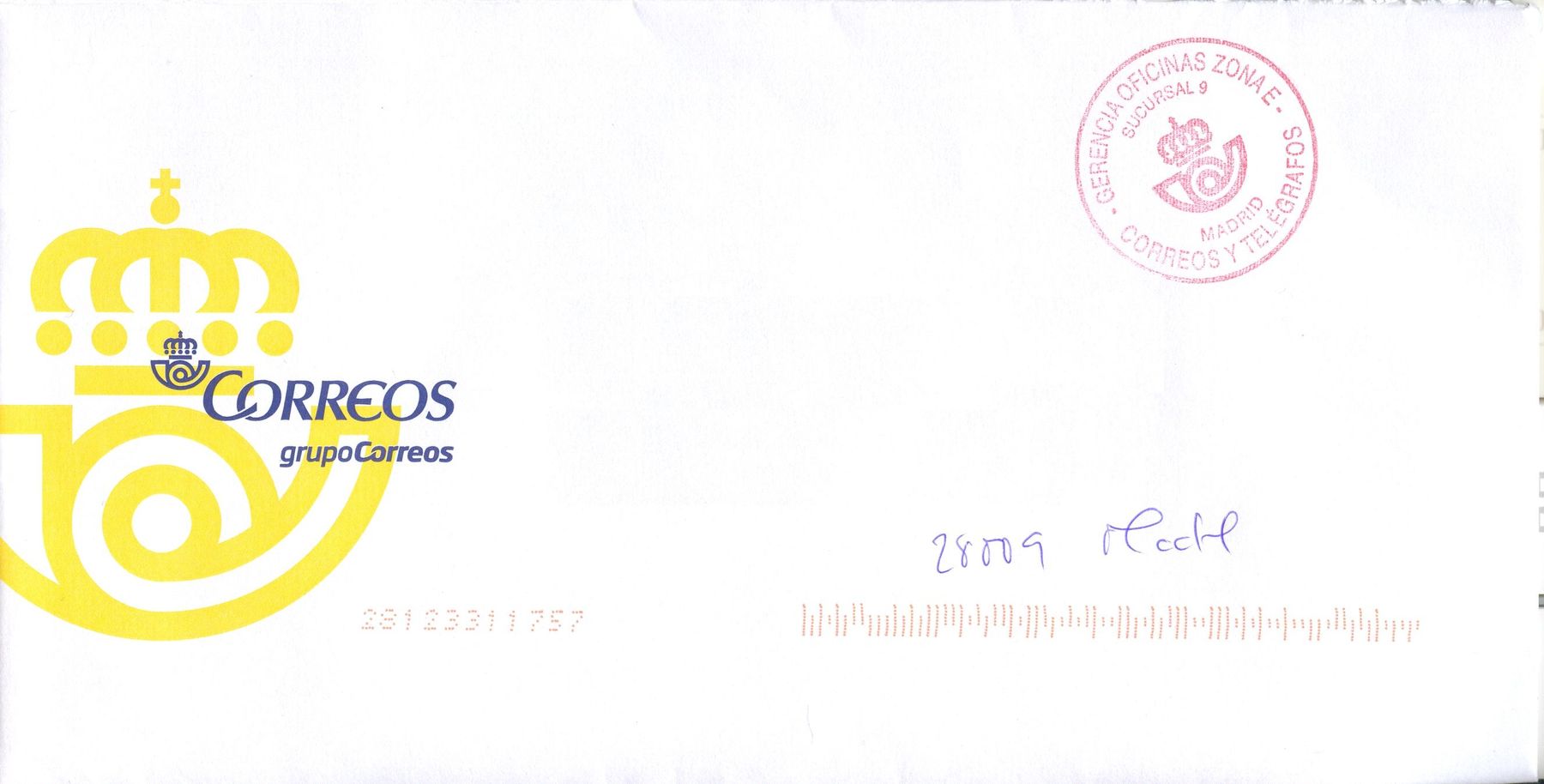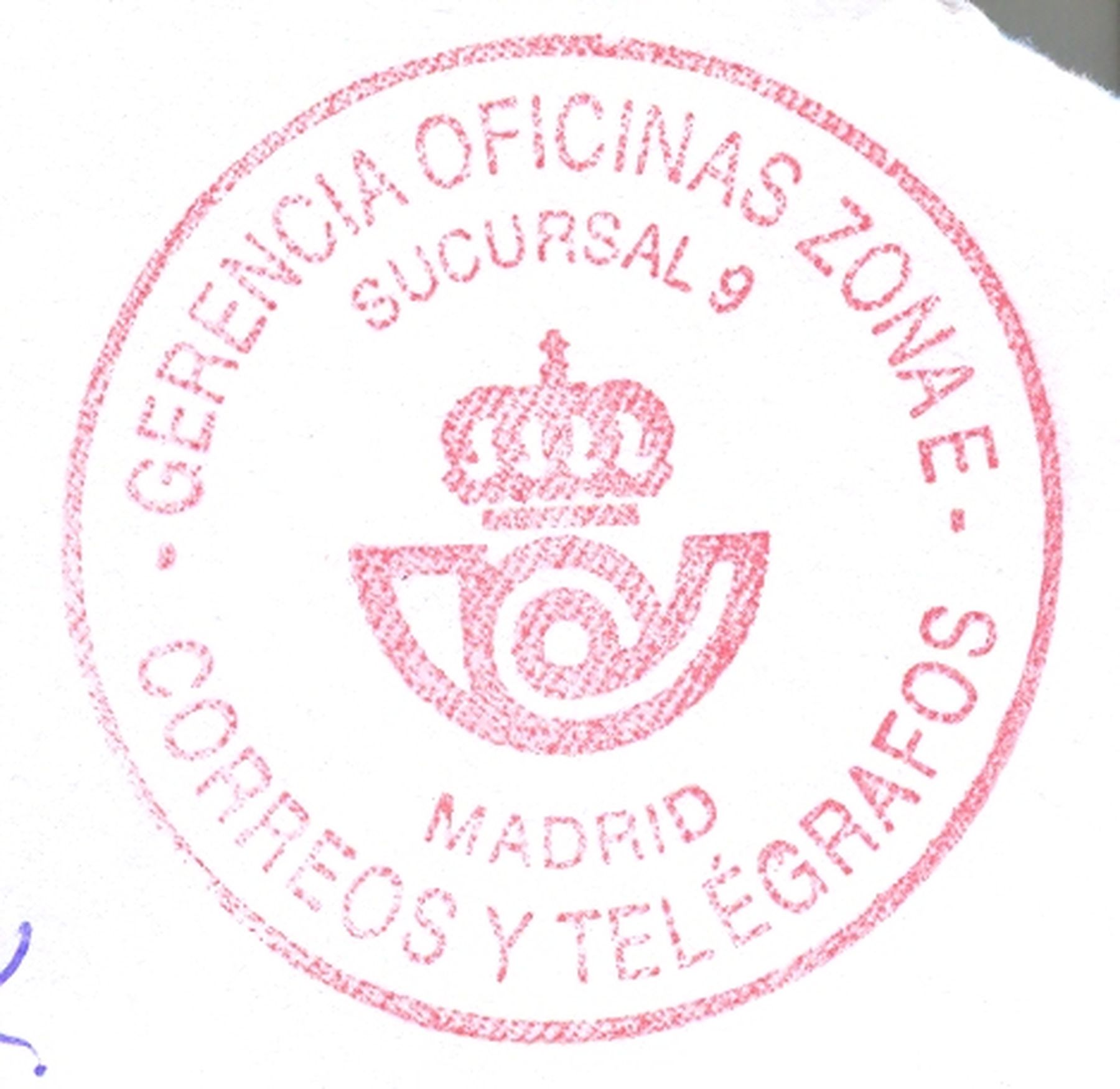 Tampón utilizado por la GERENCIA OFICINAS ZONA E / SUCURSAL 9 / MADRID / CORREOS Y TELÉGRAFOS, el 27/11/2013.
