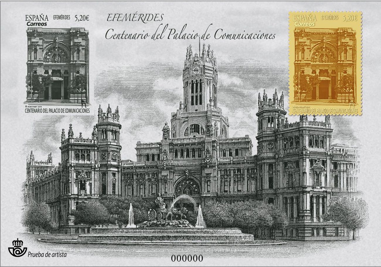También, el día 14 de junio de 2019, Correos emitirá una Prueba de Artista, con el sello en oro, de la hoja bloque dedicada al «Centenario del Palacio de Comunicaciones».