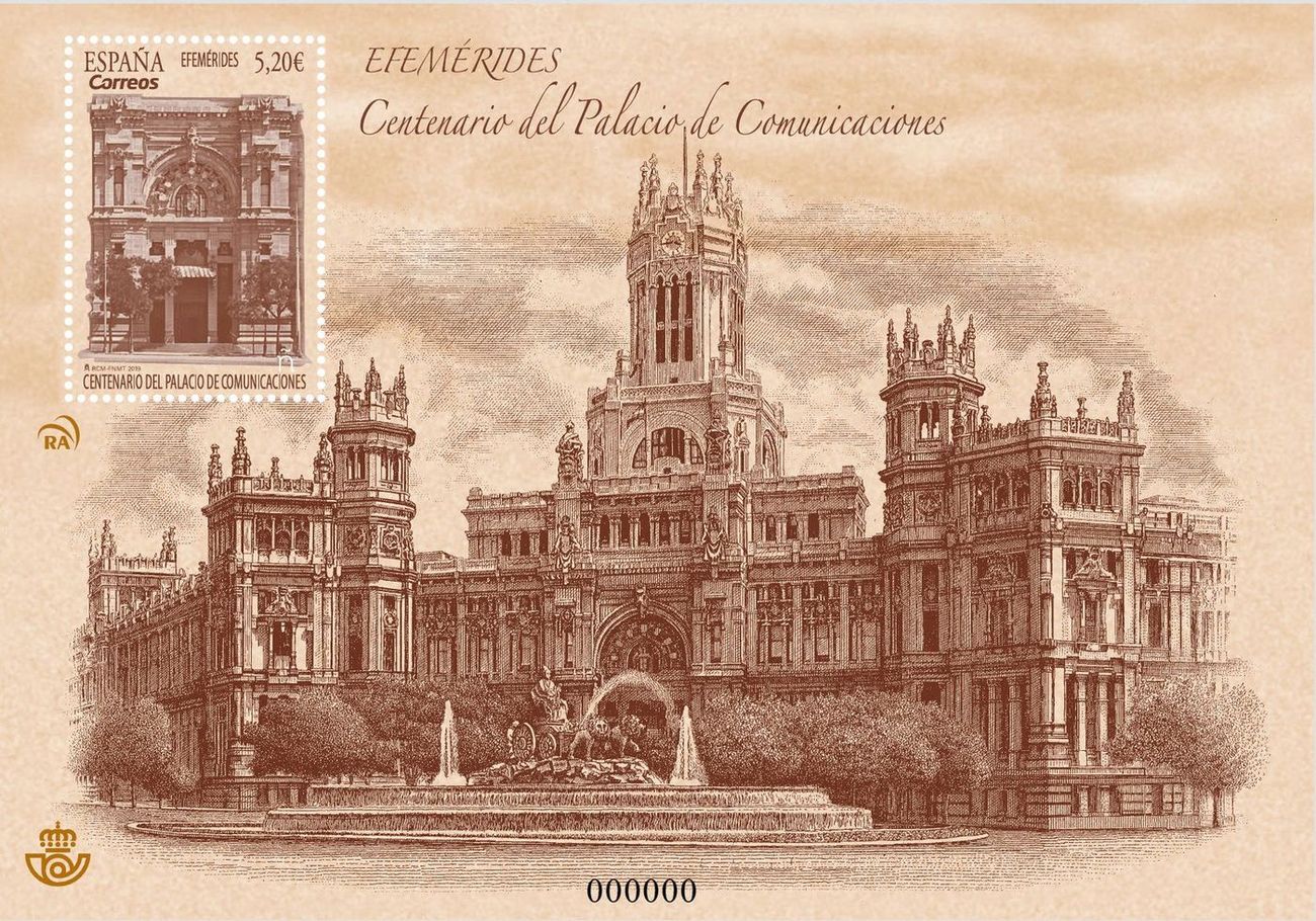 Dios mediante, el día 14 de junio de 2019, dentro de la serie «Efemérides», se emitirá una hoja bloque y un sello de correo dedicados al «Centenario del Palacio de Comunicaciones». Situado en la madrileña plaza de Cibeles, fue proyectado por los arquitectos Antonio Palacios y Joaquín Otamendi para los servicios de Correos, Telégrafos y Caja Postal de Ahorros. El edificio alberga hoy las dependencias principales del Ayuntamiento de Madrid.