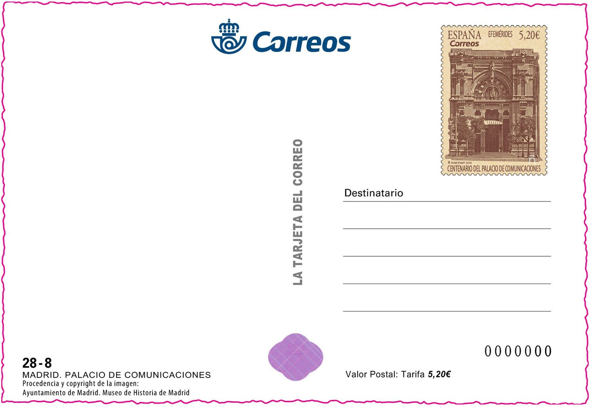 La tarjeta está ilustrada en su anverso con una vista aérea del Palacio de Comunicaciones.