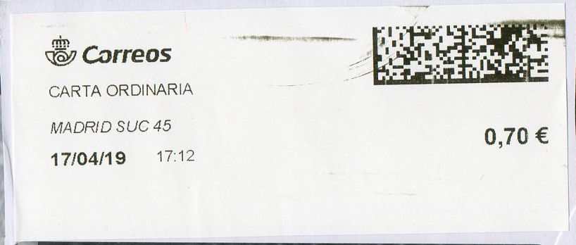 MADRID SUC 45 / CARTA ORDINARIA/ 17-04-19