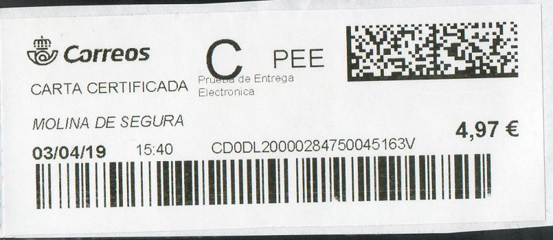 MOLINA DE SEGURA / CARTA CERTIFICADA PEE / 03-04-19