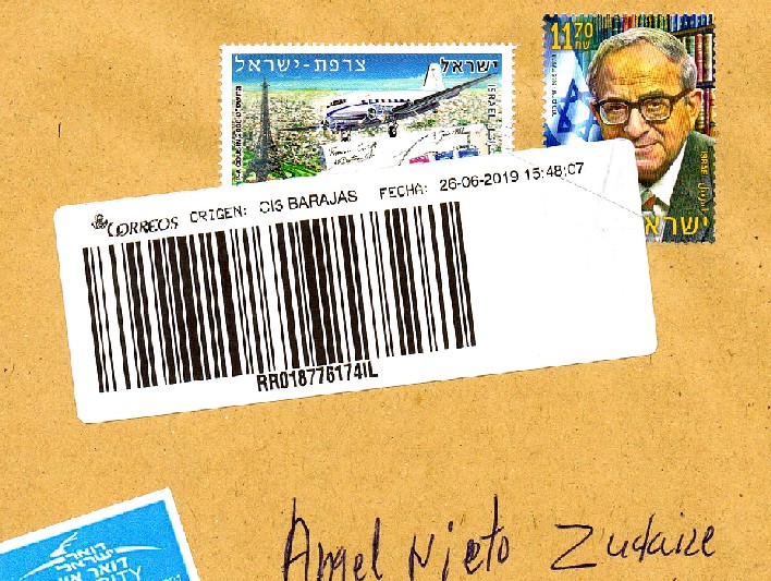 Certificado de Israel recibido hoy (se vé que en Barajas miman a los filatélicos).El sobre es de tamaño suficiente para poner la etiqueta.El consuelo es que el interior está bien