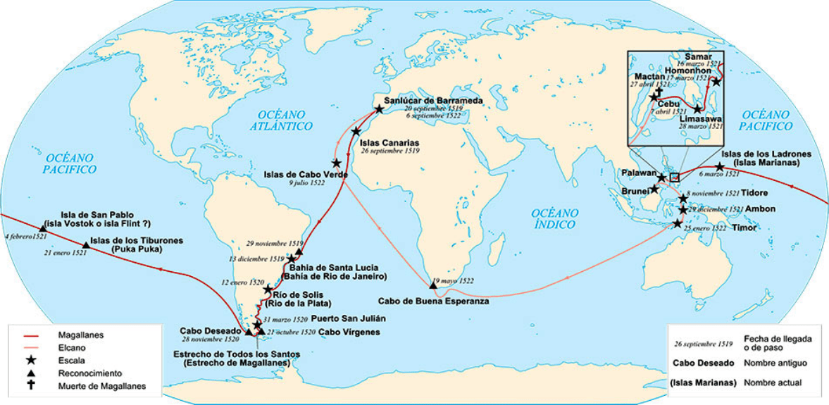 A ver si se enteran los vecinos de la izquierda: que Magallanes NO DIO LA VUELTA AL MUNDO. Que lo mataron los indígenas y se quedó en Filipinas a medio camino de la circunnavegación.