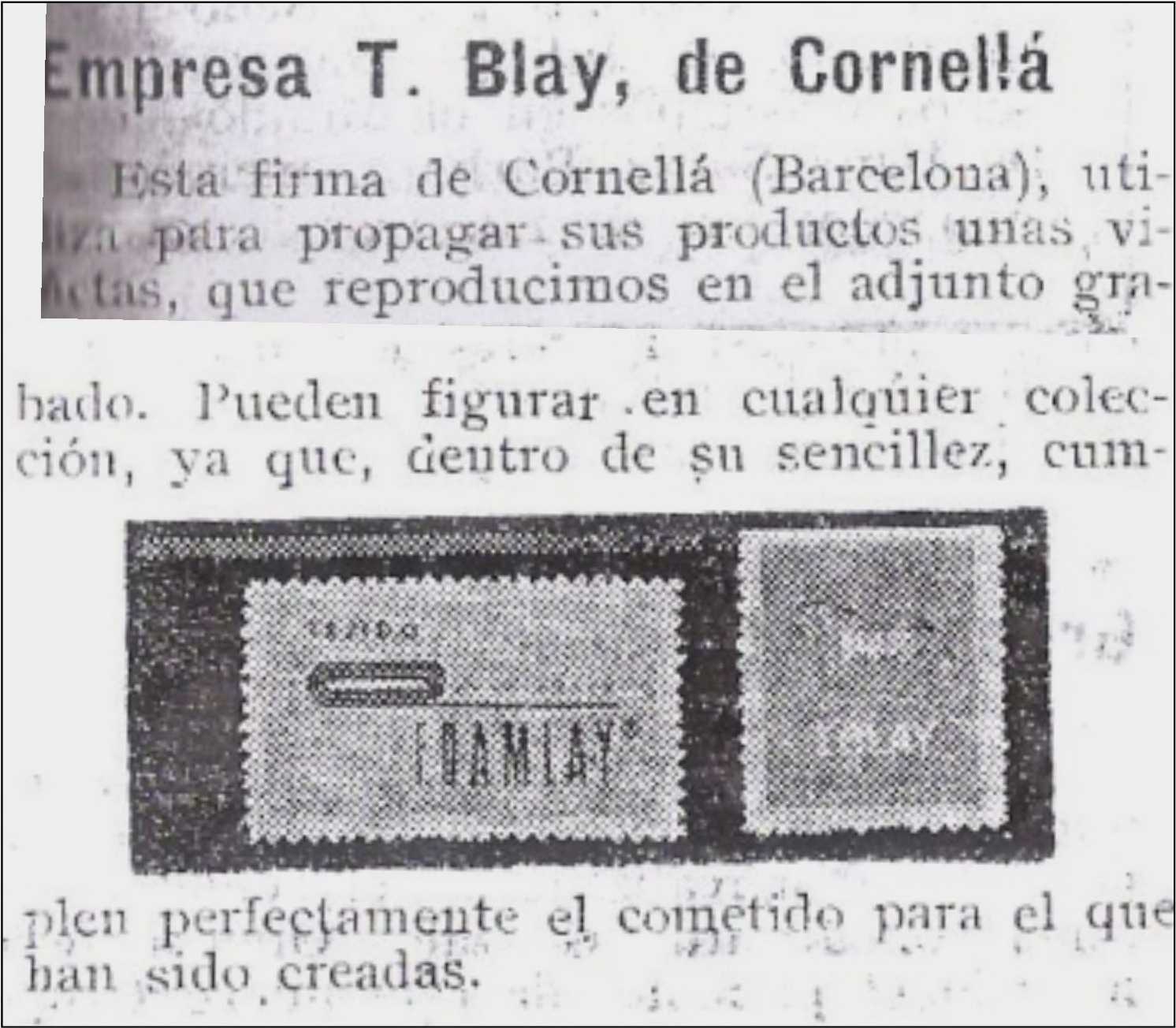 Tomás Blay era una empresa de Cornellá dedicada a la impermeabilización de tejidos, me falta una viñeta de esta casa de la que solo tengo una imagen en negro que extraje de la revista Alhambra.