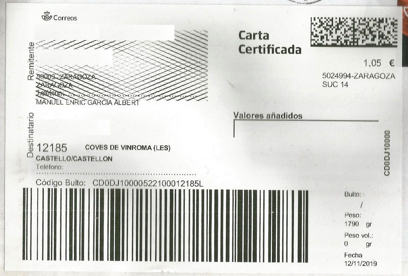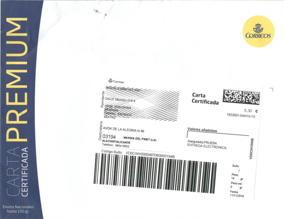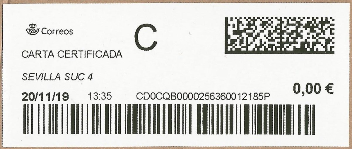 2860294 GETAFE SUC 1 | 22/10/19 | 0,00 € | CARTA CERTIFICADA | C