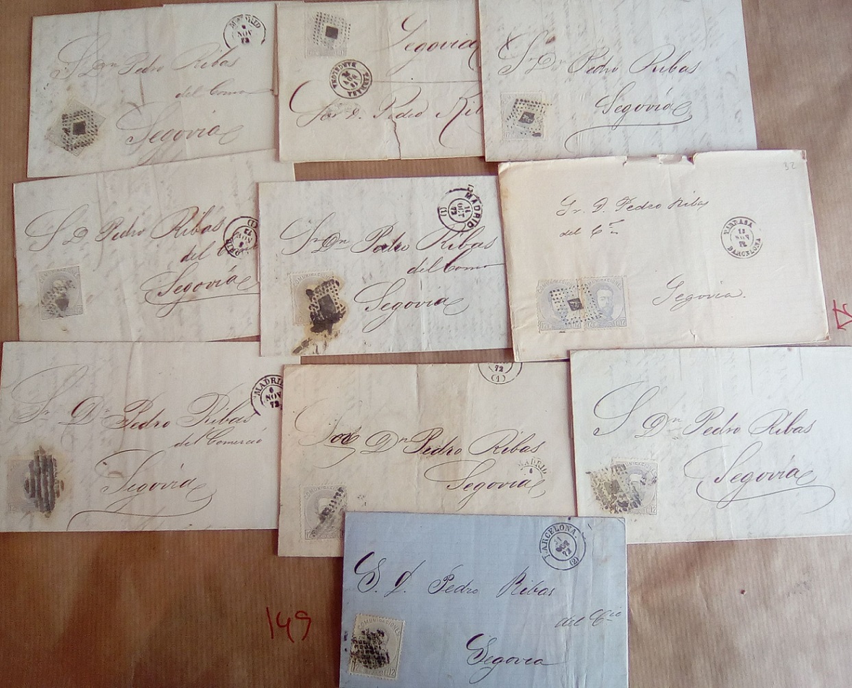 Diez cartas con sello de Amadeo de 12 cuartos Ed.122. Fechadores de Madrid, Barcelona, Tarrasa