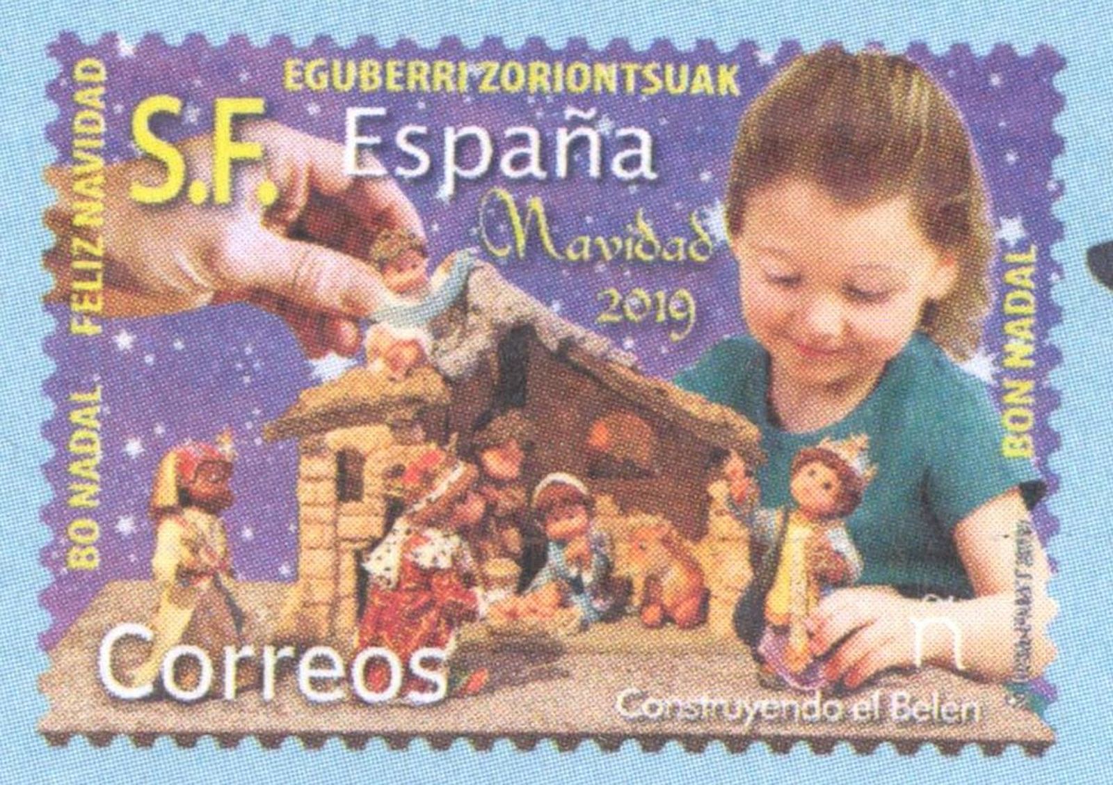 Y, a modo de franqueo, lleva impreso el sello de "Construyendo el Belén" de la serie Navidad de este año 2019, emitido el pasado 5 de noviembre, si bien, en lugar de la indicación del franqueo (Tarifa A), lleva las sigla "S.F.".