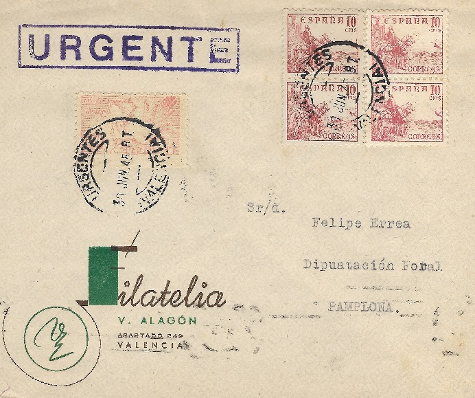 Una que no he visto en carta urgente circulada de Valencia a Pamplona el 30 de junio de 1945.