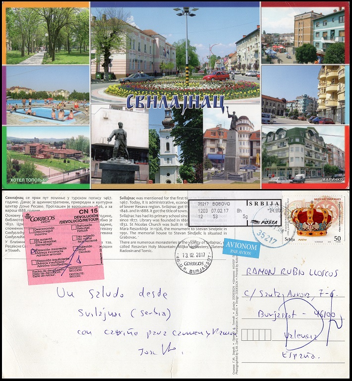 Esta tarjeta la envié desde un plueblecito serbio hace dos años, el año pasado me la enviaron porque puse mal el código postal y la devolvieron.