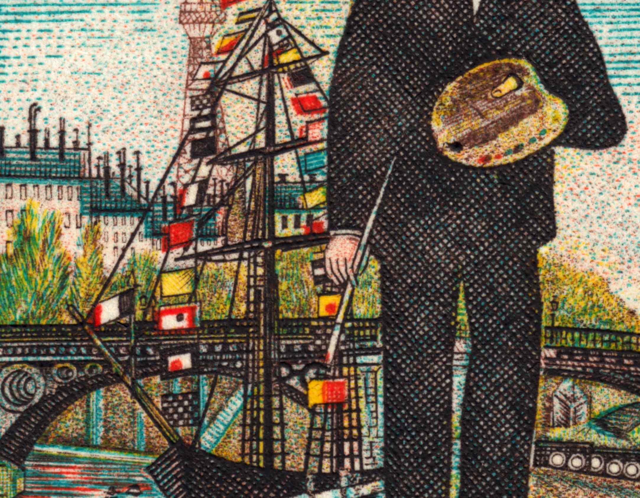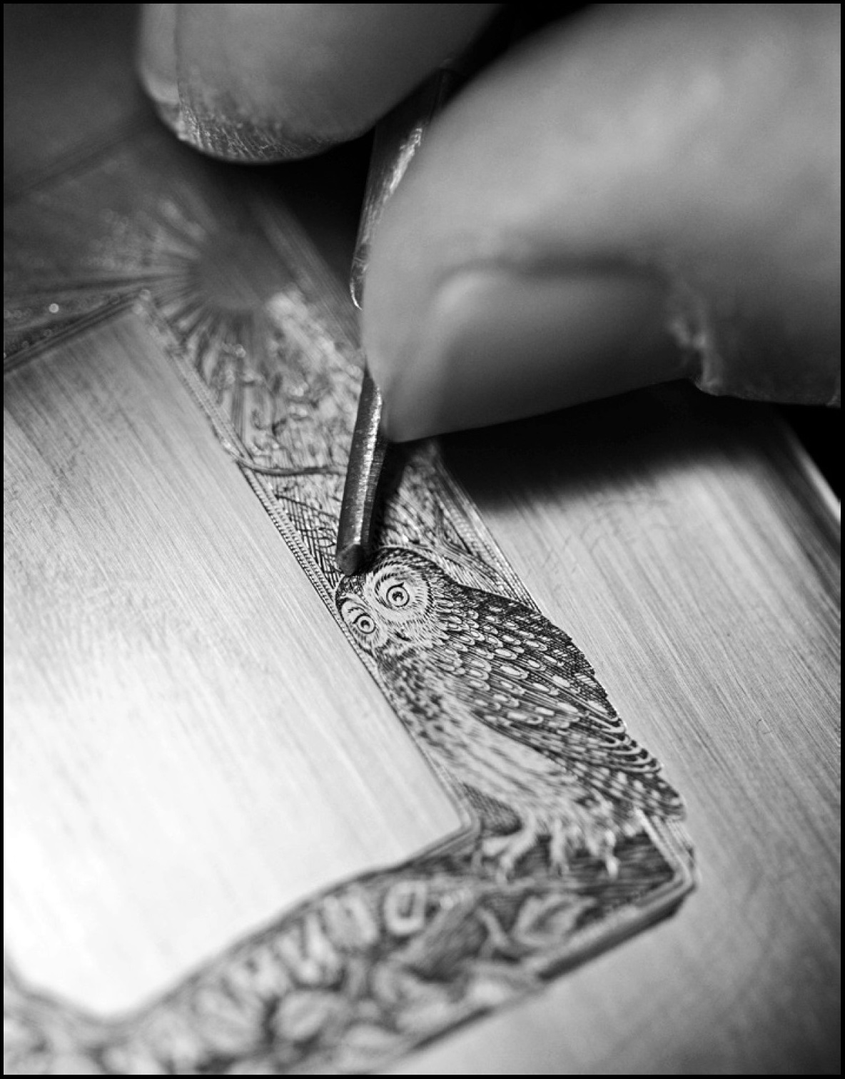 Este es el sello, sobre estas líneas y precedido por la pintura que Łukaszewski indaga con los buriles. El artista empleó 10 semanas en grabar este sello extraordinario.