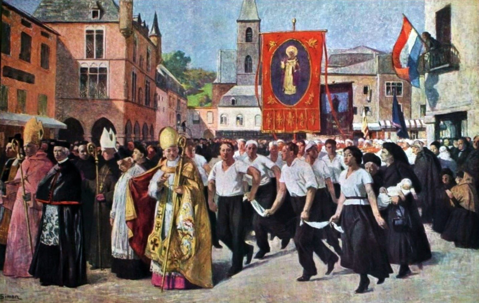 Recuperamos un gran sello ya expuesto en este tema (Luxemburgo, 1938), por haber encontrado una imagen aceptable de la pintura de Lucien Simon (1936, La procesión danzante en Echternach) que entalló genialmente Sem Hartz.