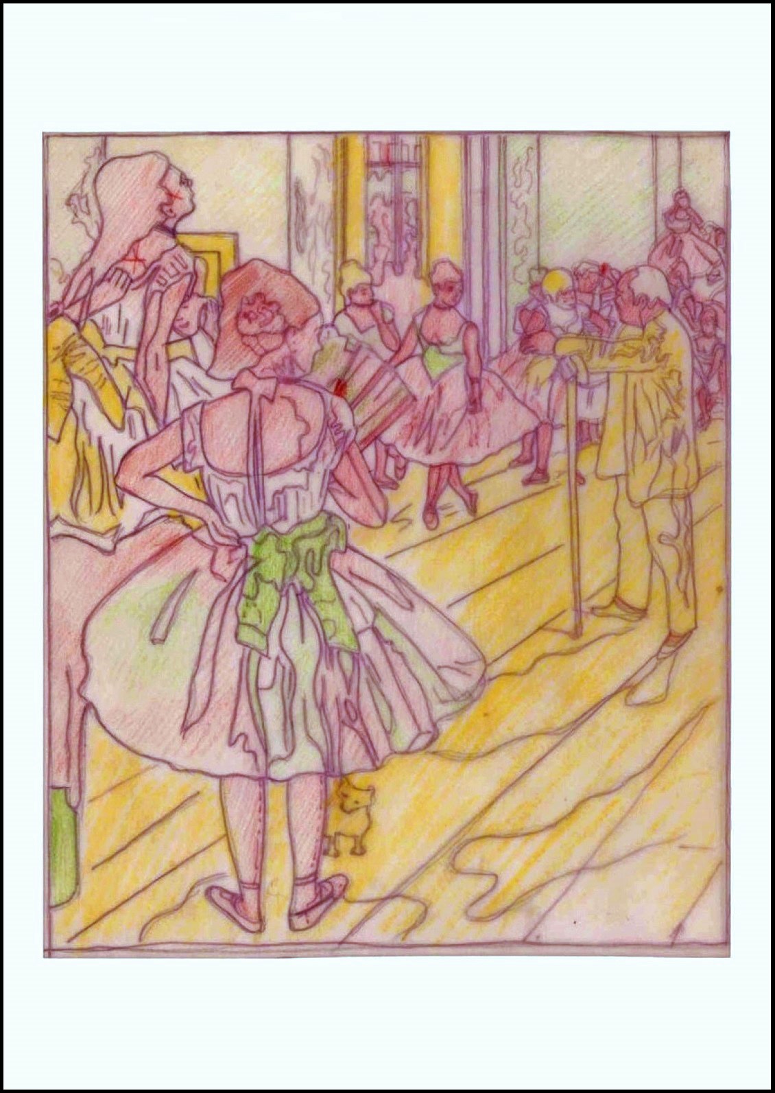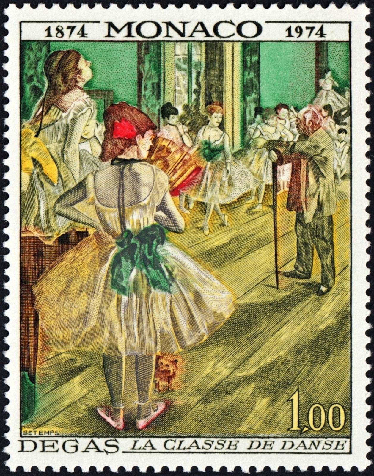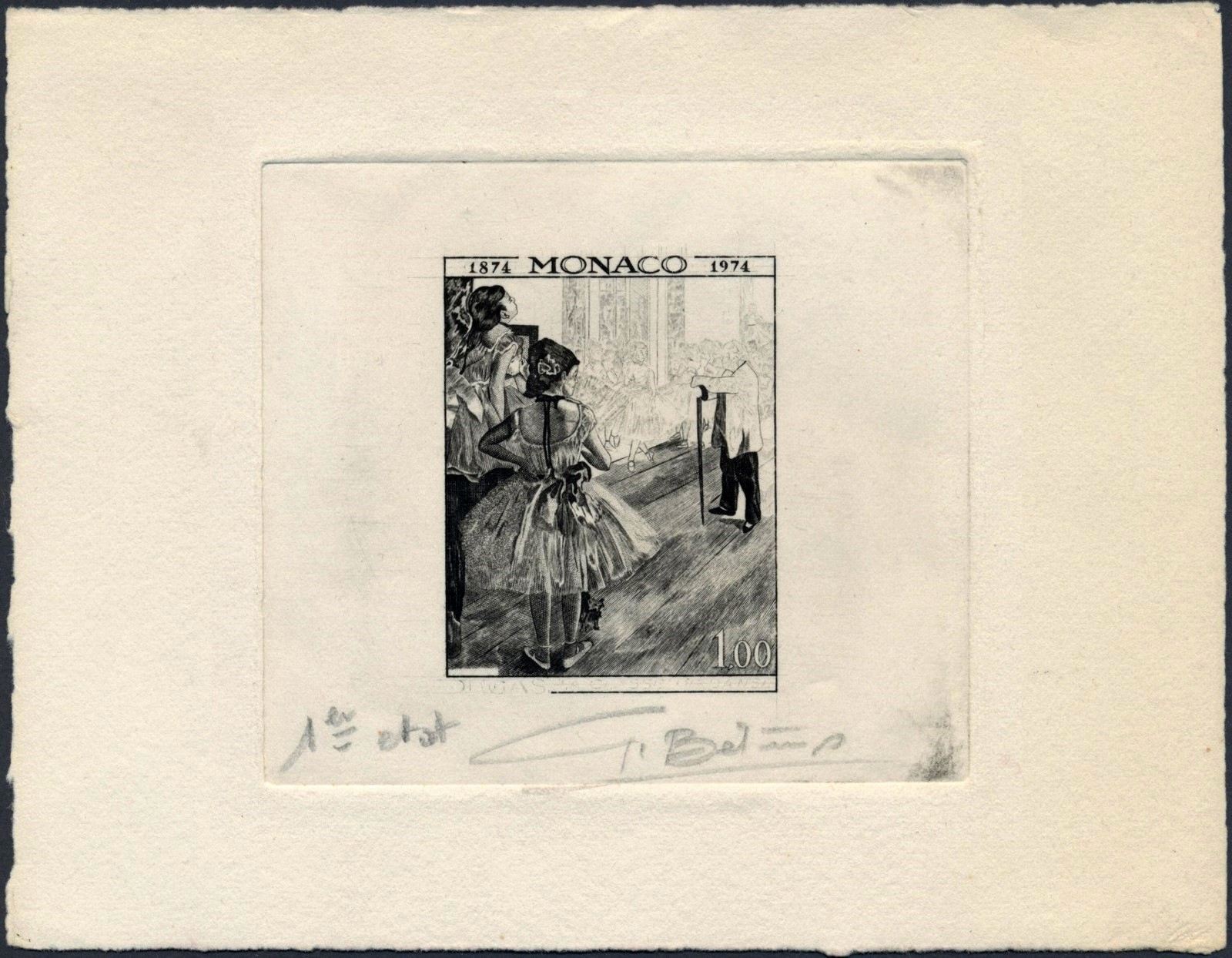Aquí podemos ver un pequeño ejemplo, con este boceto de líneas generales y de color de Georges Bétemps, con vistas a los diseños específicos de grabado de su gran sello de Degas (Mónaco, 1974).