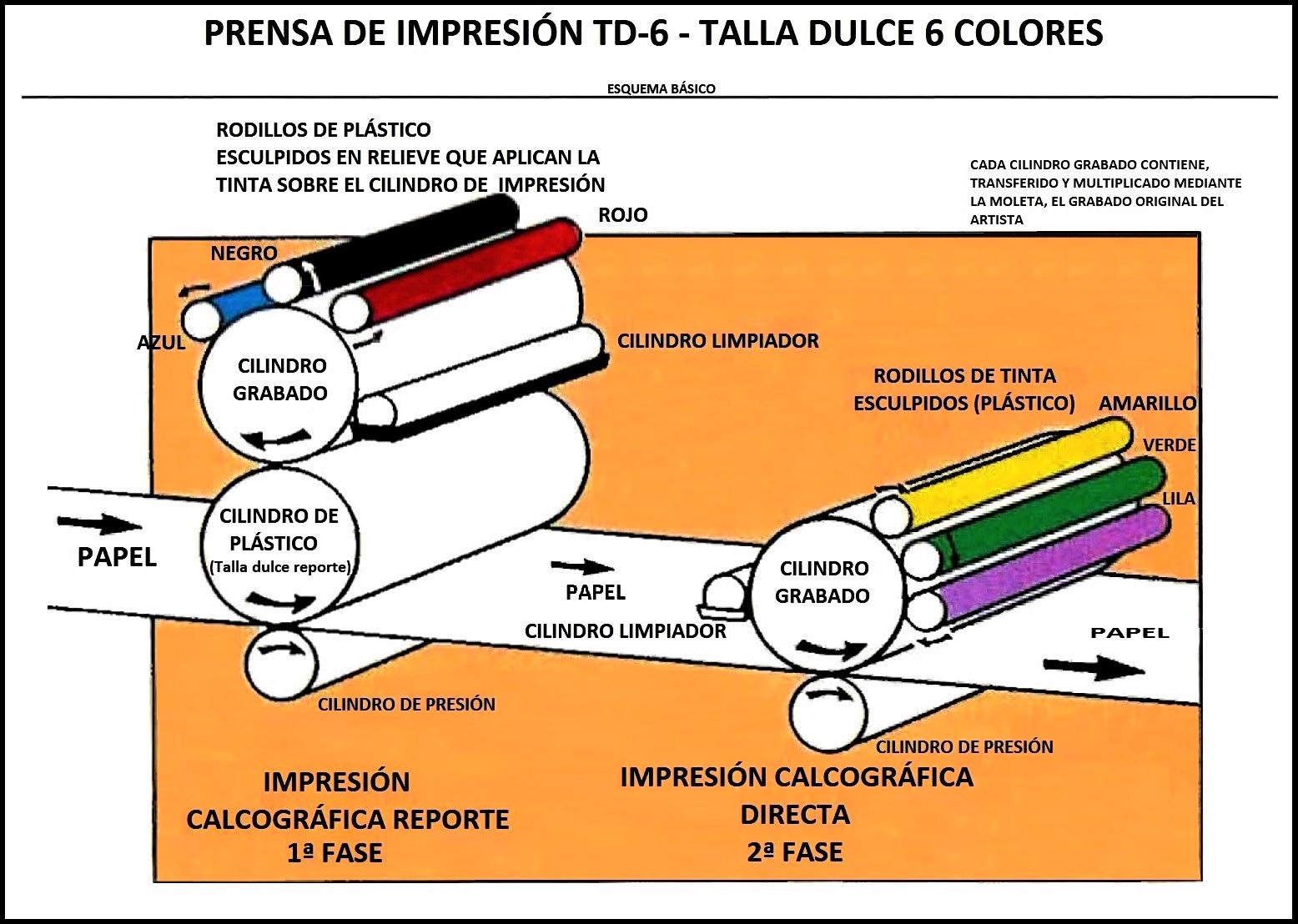 La clave técnica novedosa de la prensa TD-6, qué duda cabe, es el rodillo de plástico interpuesto, durante la primera fase de la impresión calcográfica, entre el cilindro de grabado y el papel. Esta es la llamada impresión reporte y la razón por la que el grabador incide una de las placas en positivo, es decir, no en espejo como es habitual, y como de hecho labra la destinada a conformar el segundo cilindro de impresión calcográfica, que, esta sí, es directa sobre el papel. Tras estas palabras y como ejemplo, exponemos dos pruebas de estado de sendos grabados de Bétemps, en positivo y en negativo, para el sello de Degas que emitió Mónaco en 1974.