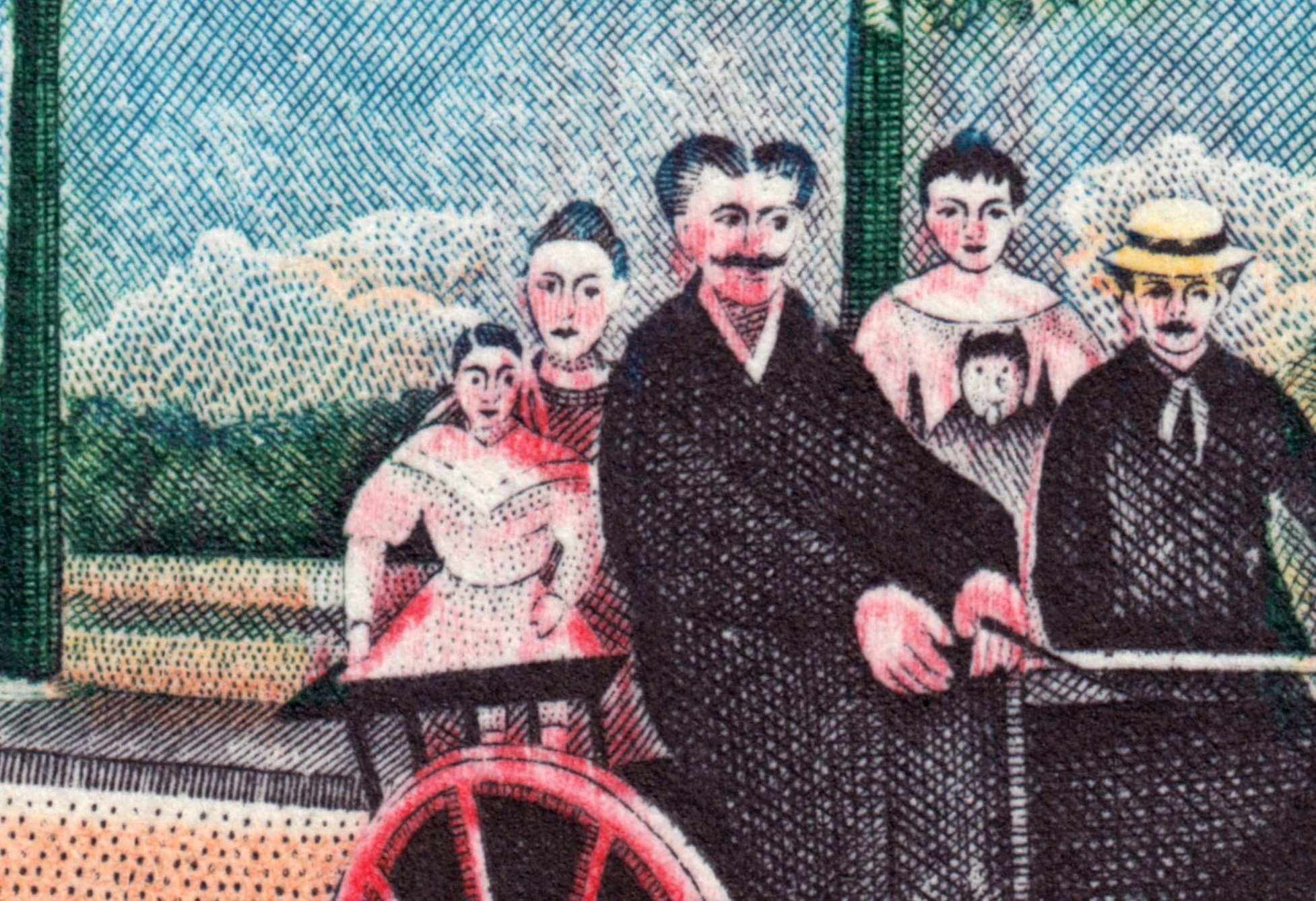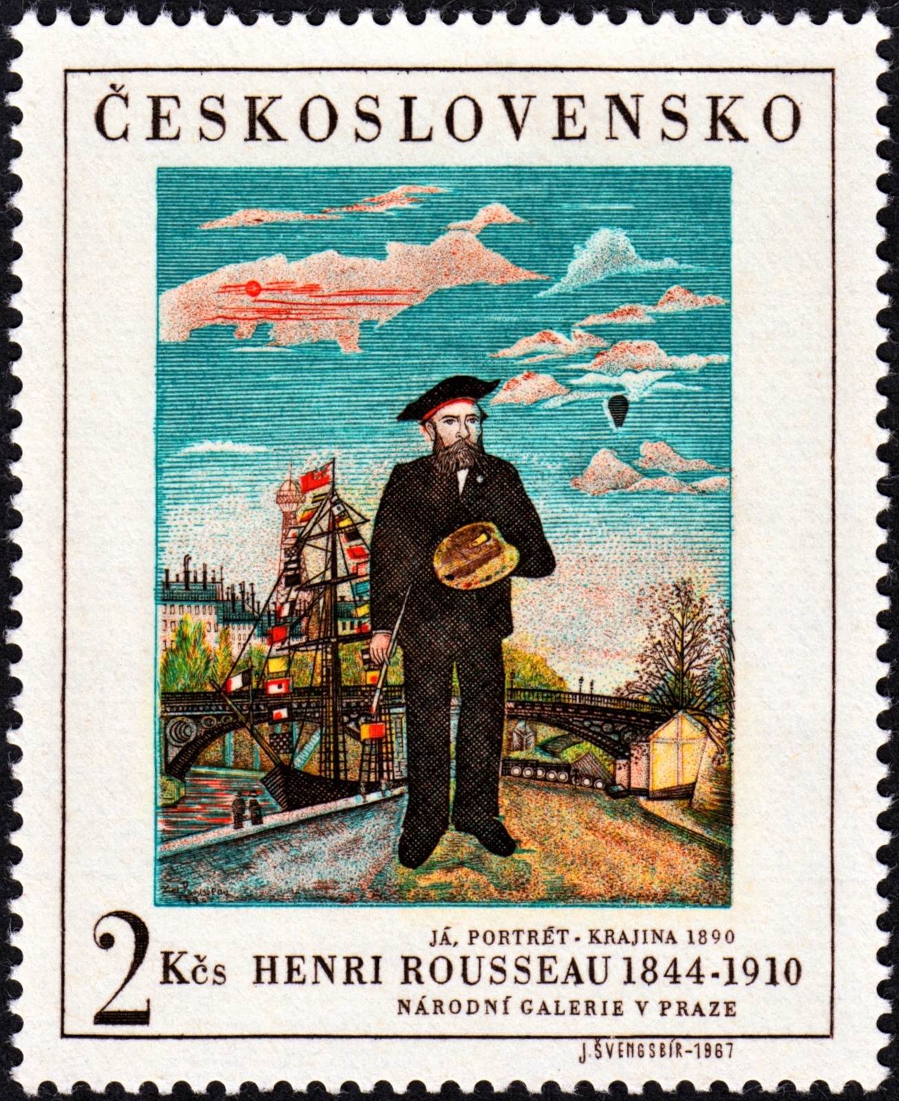 Veamos la diferencia de esa malla artística que decíamos entre los sellos checoslovacos y franceses de arte, sobre dos pinturas de un mismo artista, Henri Rousseau.