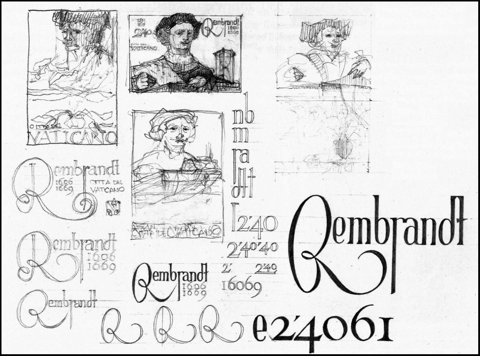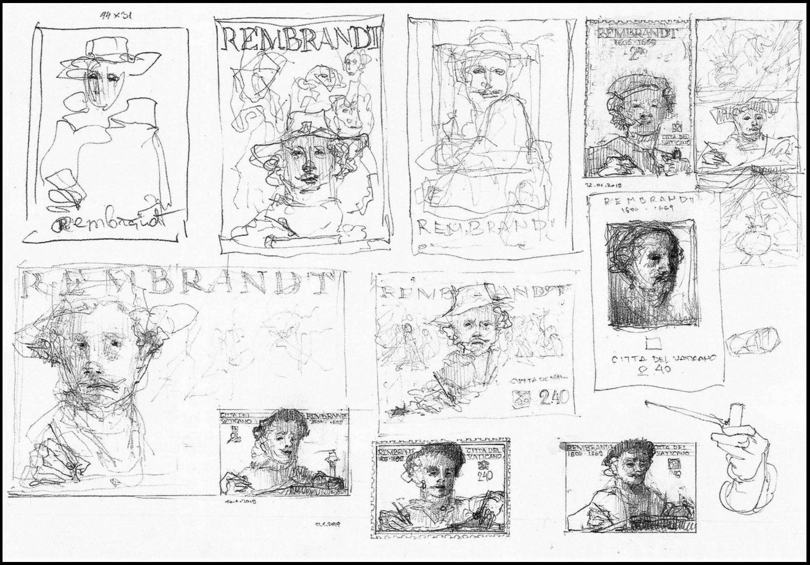 «Fue una gran sorpresa para mí cuando en enero de 2019 recibí la solicitud de crear este sello de Rembrandt. En general, es más fácil dibujar un sello con un tema histórico que un retrato de un artista genial, ¡y quién lo es más que Rembrandt! Así que lo primero que hice fue preguntarme si podría hacerlo bien, y mientras esto pasaba, al mismo tiempo ya estaba ensayando proyectos en mi cabeza. La primera idea fue hacer un retrato con el lenguaje propio del grabado. Pensaba en un aguafuerte o una litografía, pero recordé que el servicio filatélico del Vaticano quería color.