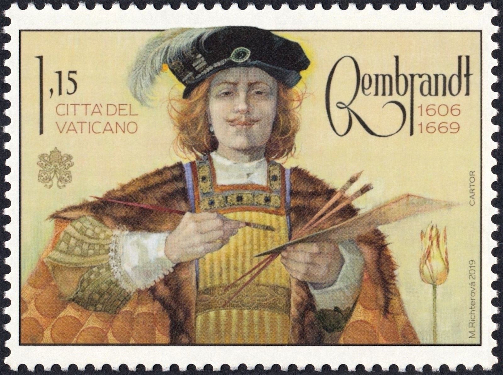 Gracias a Michael Lamothe, que le hizo unas preguntas para el último boletín filatélico Vatican Notes, tenemos una explicación muy completa de la artista sobre su sello de Rembrandt emitido por Vaticano a finales de 2019, y del que en la página anterior ya hablamos.