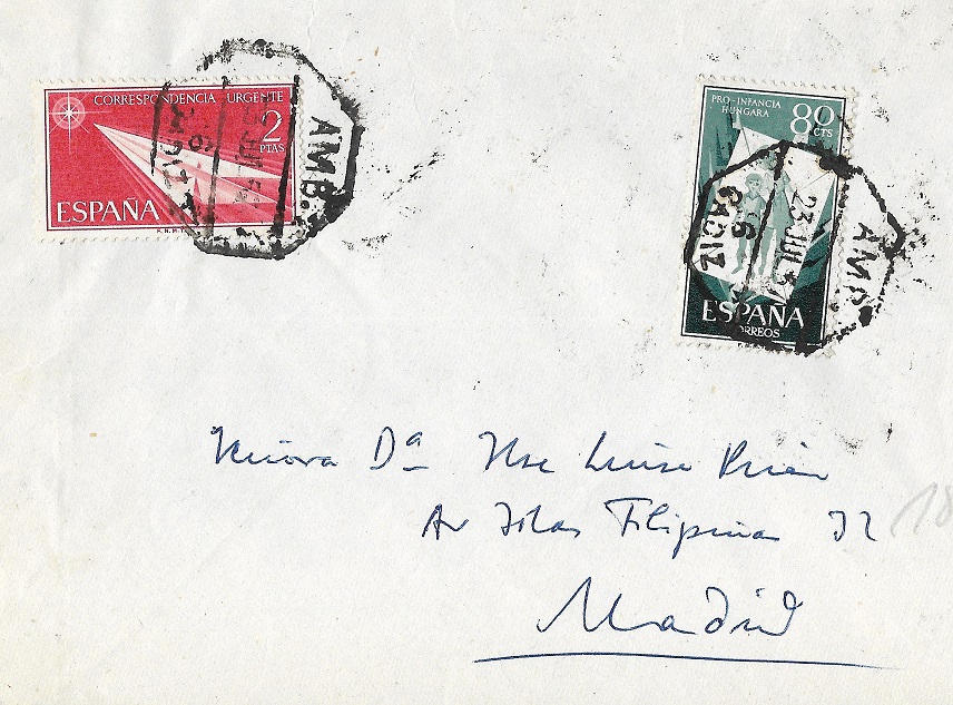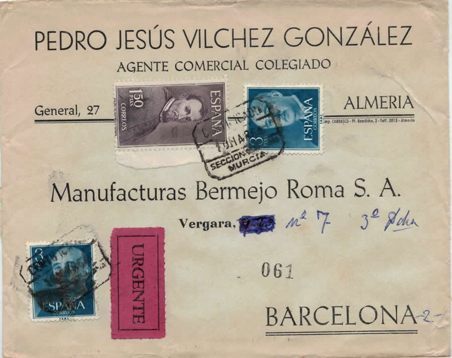 Si el envío era perentorio, es de imaginar que el remitente escogió el servicio más rápido y seguro que ofrecía CORREOS. Cabe aclarar que en la tarifa de 11 de mayo de 1959, la diferencia entre las dos modalidades de urgente era de una peseta (3 Ptas. urgencia corriente y 4 Ptas. la especial), ya que el URGENTE ESPECIAL se mantuvo igual que en la tarifa de 10 de julio de 1954, en 4 Ptas. Así pues, una Pta. era cantidad asumible si lo que se pretendía era máxima celeridad que le podía proporcionar el URGENTE ESPECIAL y no fue este el caso.