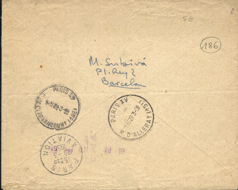 fecabo La carta fue expedida el 10 de marzo de 1959, fecha en la que todavía estaba en vigor la tarifa de 1954 (10.07.9154-10.05.1959) lo que hace necesario el recálculo del porte: Carta nacional hasta 100 gramos (5 x 0,80 + 0,10) = 4,10 pesetas + certificado = 1 peseta + urgente = 2 pesetas; son 7,10 pesetas con un sobrante de 40 céntimos...
