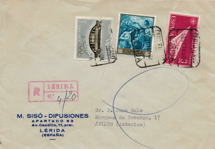 Sobre certificado-urgente con fechador 16-OCT-65 10 M y según tarifa 11 mayo 1959. Sello de 1 pta. tarifa de carta + 1,50 certificado + 3 urgente = 5,50 ptas. Los tres sellos están colocados según orden del servicio que prestaban y tarifa. Estamos ante un sobre enviado por un comerciante filatélico, eso no merma que sea una combinación poco corriente.