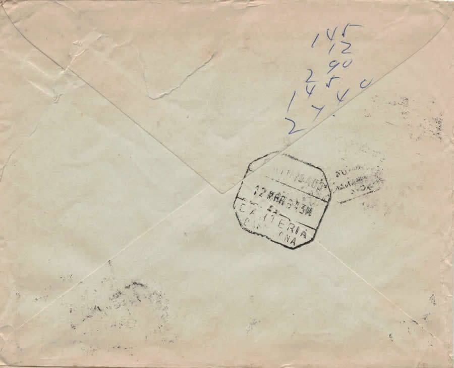 aúnque no pierdo la esperanza de que algún día yo seré capaz de encontrar un sobre con un sello para el servicio "Urgente Especial" –ya establecido en 1942– usado como previsto, hoy quisiera mostraros la única pieza por correo urgente especial en mi colección y tal mismo tiempo la única jamás visto por mí (puesto que aquí en Alemania no podía hallar nada de este tipo). Tampoco se usaban un sello de urgente especial pero por lo menos el franqueo es correcto: