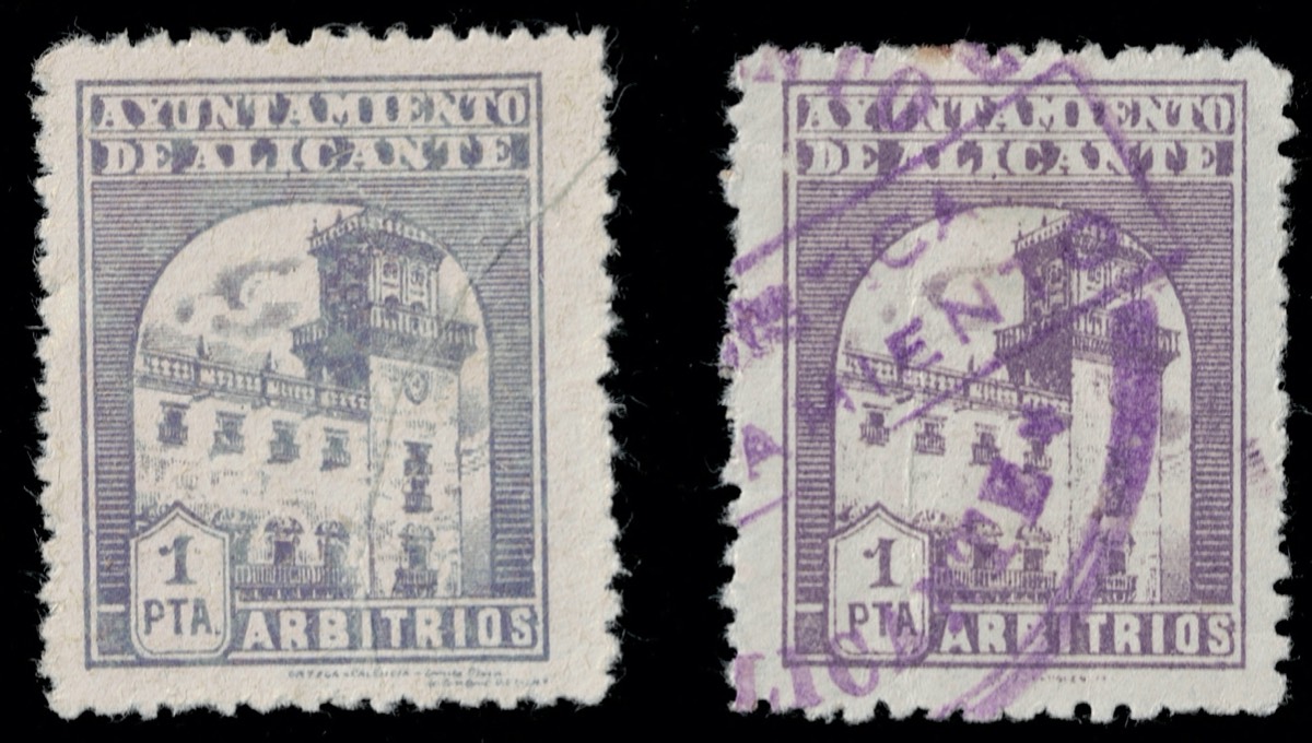 Empecemos por Alicante ... La 1 peseta en morado es común, pero también la tengo en gris. Tenga en cuenta el punto después de PTA y la imprenta diferente bajo "arbitrios".