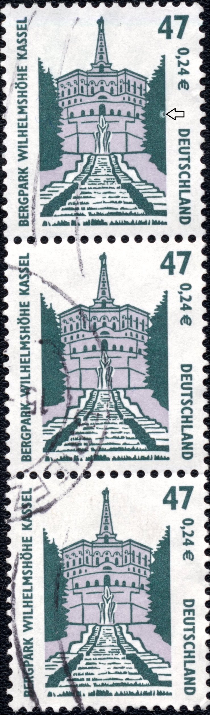 Bonita tira de tres sellos básicos, probablemente procedentes de bobina, la "mosca" se posó en el árbol de la derecha del primer sello