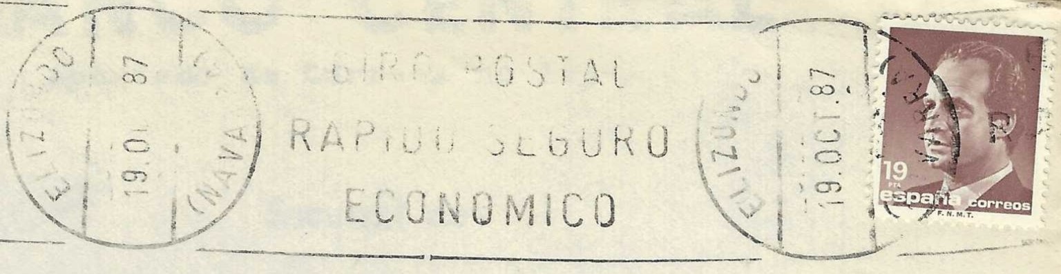 ELIZONDO 19 OCT 87 (NAVARRA) : "GIRO POSTAL RAPIDO SEGURO ECONOMICO"
