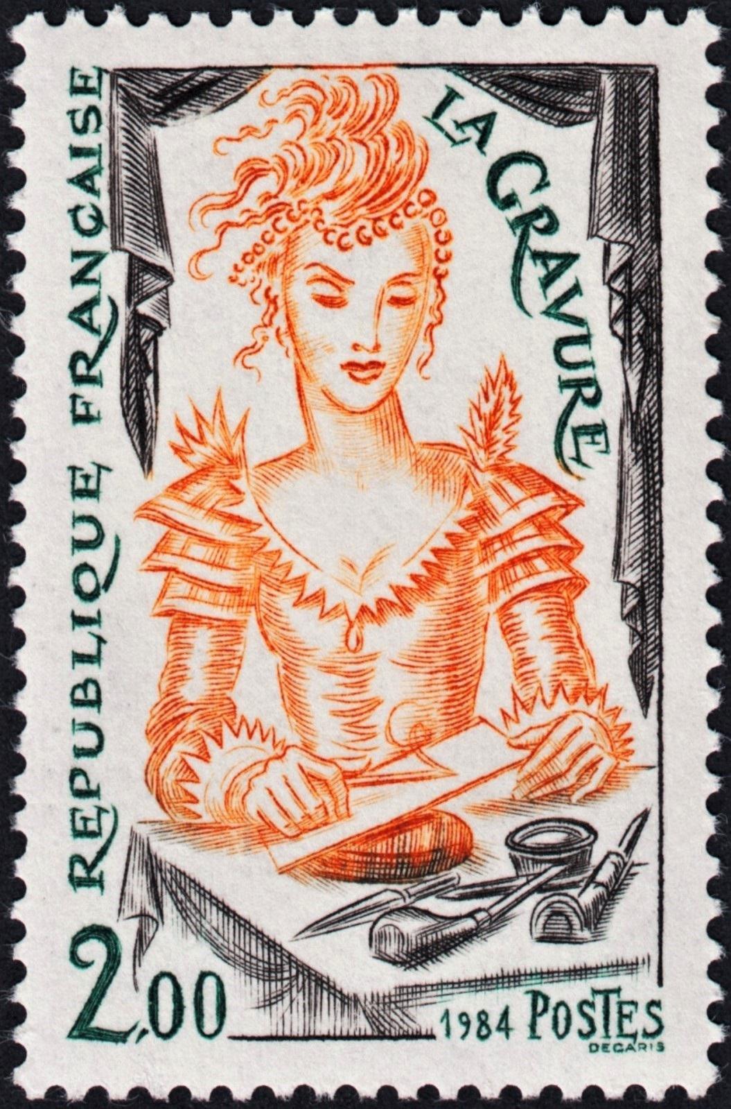 Dejamos una buena imagen del diseño original de Albert Decaris para su gran sello de 1984 sobre el arte del grabado.