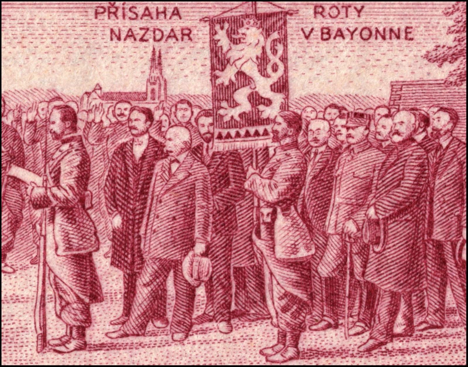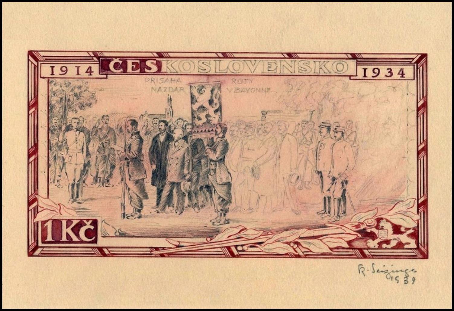 Supuestamente es un boceto de Karl Seizinger de uno de sus mejores sellos, pero teniendo en cuenta que el diseño fue obra de Václav Fiala, más bien parece que el grabador pudo realizar este dibujo con posterioridad a la emisión del sello checoslovaco en 1934. Aparecen con frecuencia en las subastas este tipo de dibujos de Seizinger, y todos se presentan como bocetos de diseño del artista, pero están demasiado aseados, y quizá su objeto no fuera otro que preparatorio de una exposición propia o bien y simplemente, la ayuda imperiosa para la subsistencia en aquellos lustros posteriores tan inciertos y apremiantes.