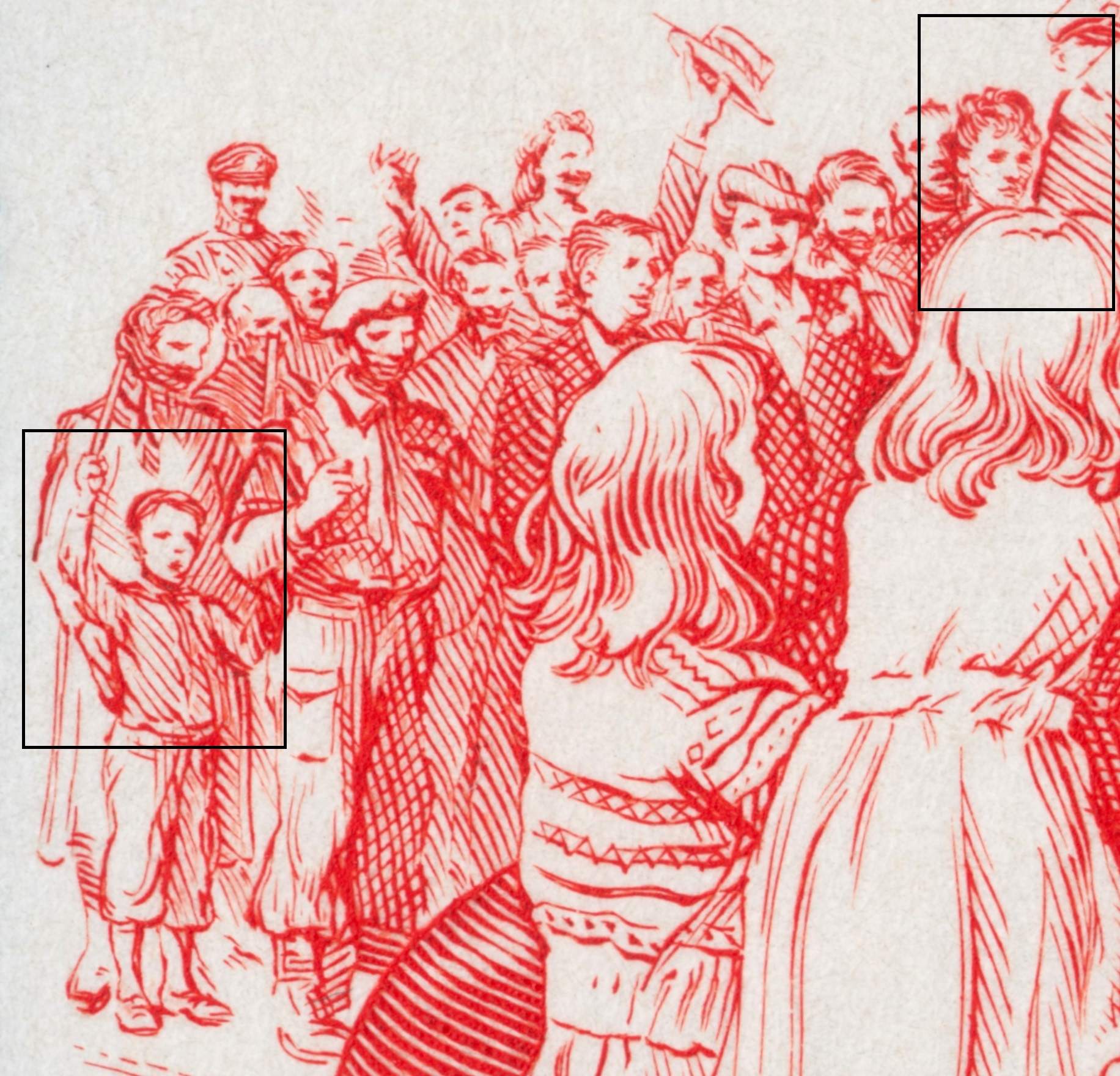 En todo caso, y aunque el valor filatélico pudiera ser ninguno, la fruición visual es grande. Seizinger siempre consideró este sello como el mejor de su obra filatélica, y recordaba haber tenido que hacer distinguibles más de 30 fisonomías, cada una en el espacio aproximado de una cabeza de alfiler. El espacio total en el que Seizinger retrató a más de una treintena de personajes, ¡y sólo por curiosidad lo acabo de medir!, fue exactamente de 3.3 por 1.3 centímetros.
