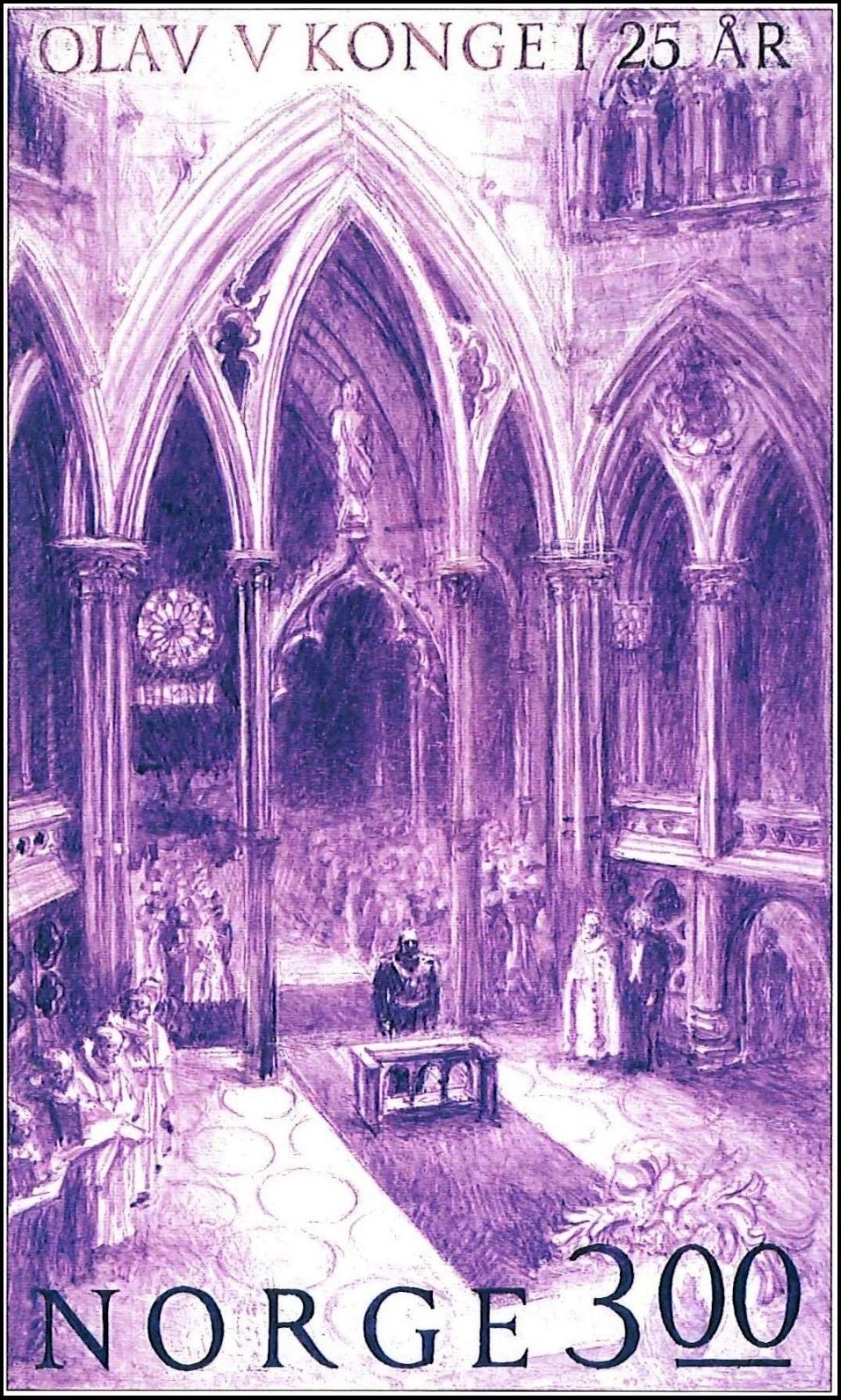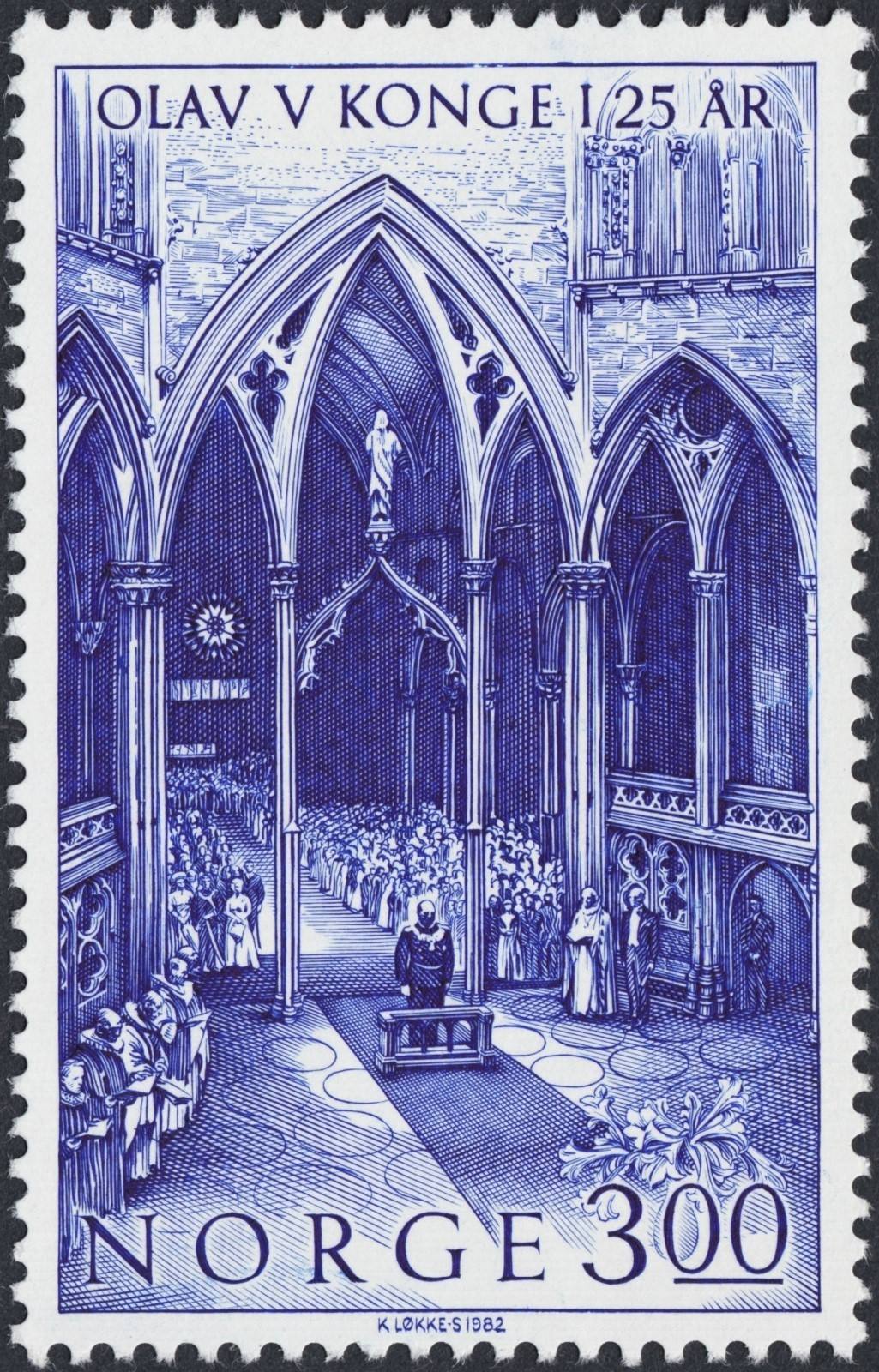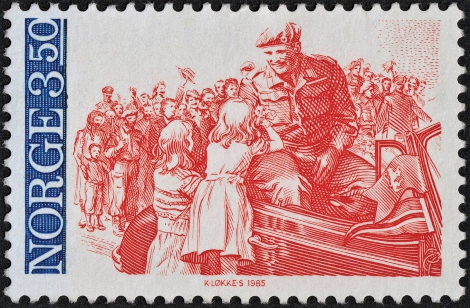 En este sello noruego de 1985, muy sencillo y pareciera que protocolario sin más, Løkke-Sørensen ensaya una deliciosa y personalísima encrucijada. En el proceso de diseño, el grabador utilizó una fotografía de Sverre Heiberg tomada en mayo de 1945, con la vuelta a Noruega del príncipe heredero Olaf.