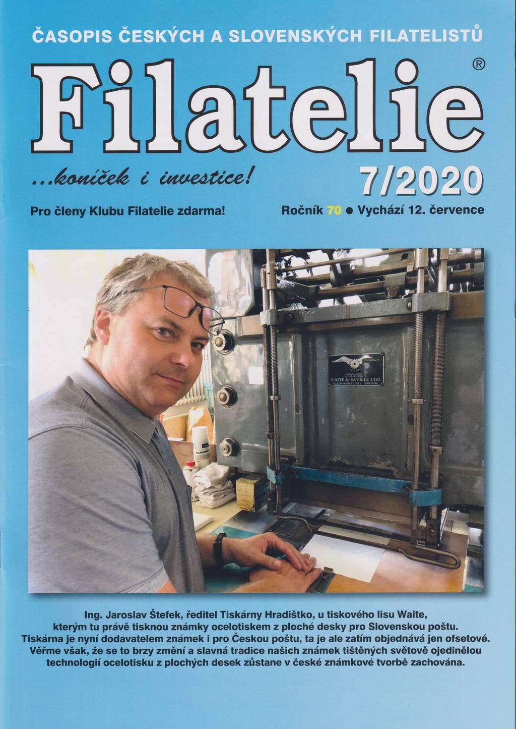 «Jaroslav Štefek, director de Tiskárna Hradištko, con la imprenta Waite, que actualmente imprime sellos desde planchas planas para Slovenská Pošta. La casa Tiskárna Hradištko imprime actualmente los sellos para el correo Checo, hasta el momento sólo en offset. Sin embargo, creemos que esto cambiará pronto y la famosa tradición de nuestros sellos podría mantenerse en el futuro. La impresión calcográfica desde pequeñas planchas planas se conservará en la fabricación de sellos checos».