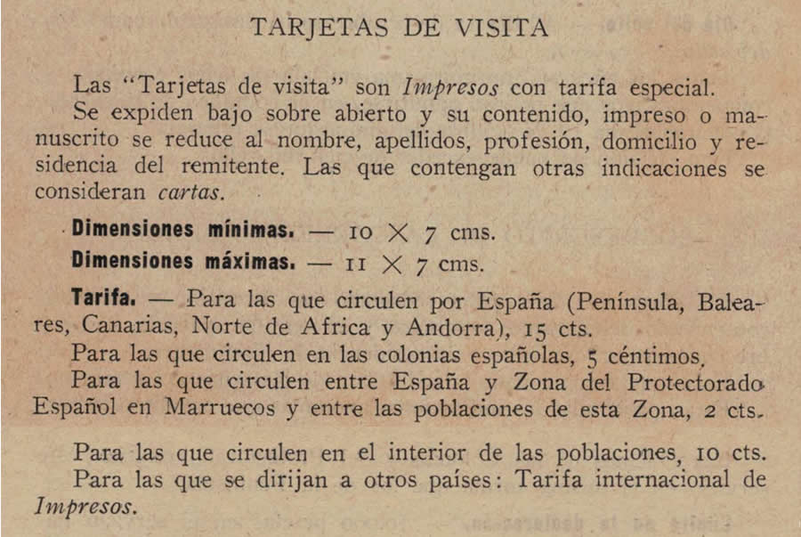 Tarjetas de visita que sólo contengan los nombres, cualidades y domicilio: Cada 10 gr. o fracción: 6 céntimos.