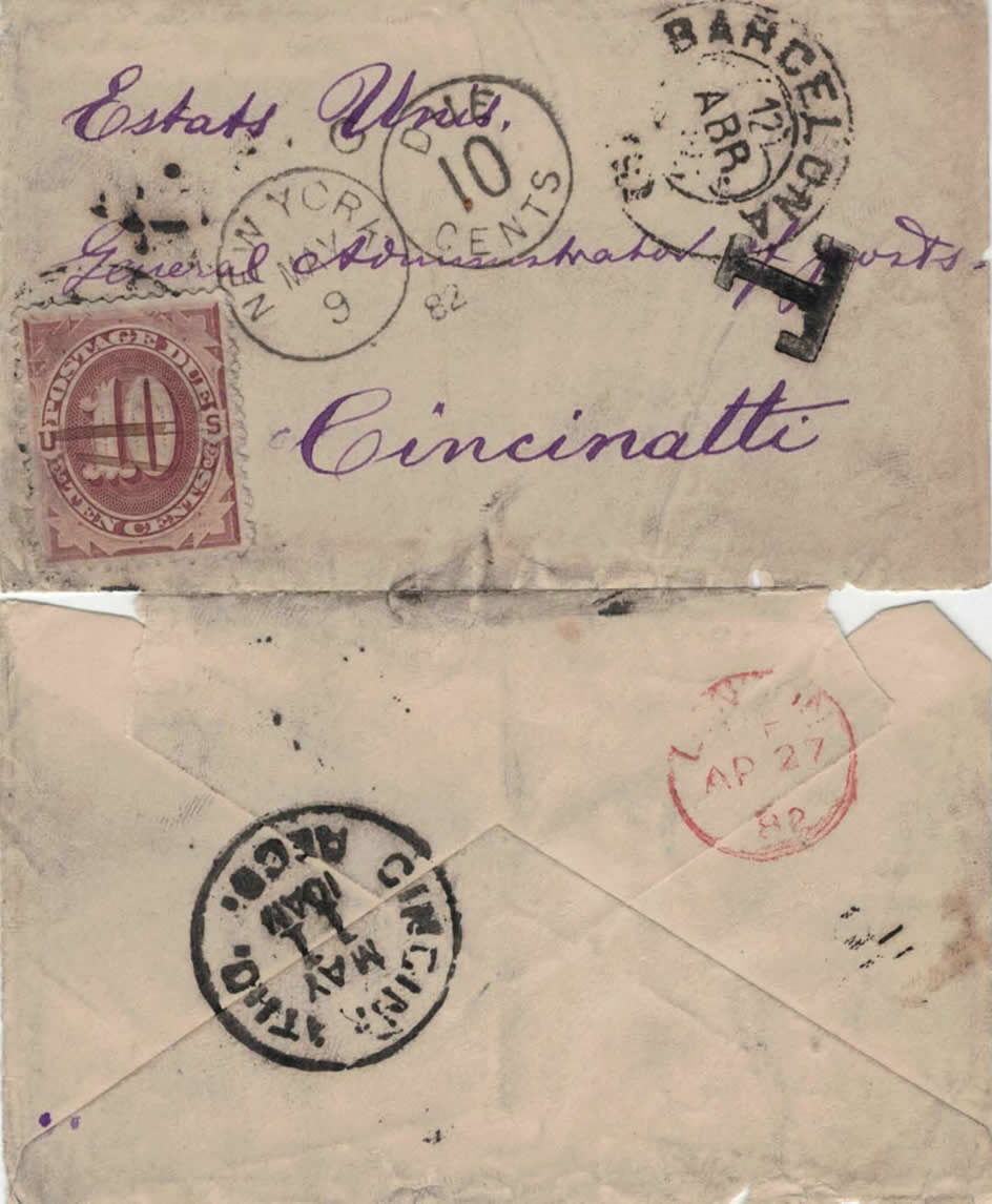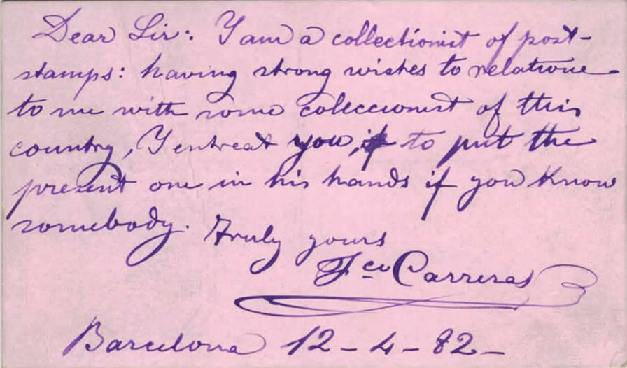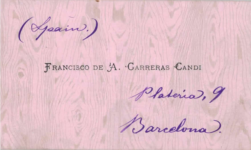 Seguidamente mostrare un sobre que tiene un significado especial para los filatélicos, se trata de un sobre enviado por Francesch Carreras y Candi al Administrador de CORREOS de Cincinatti. En el interior del sobre hay un retal de periódico y una tarjeta de vista de un jovencísimo Carreras. Los fechadores son de 1882 y la tarjeta está impresa en papel especial de aguas.