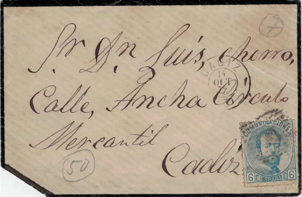 Sobrecito de luto circulado como correo interior en Cádiz y franqueado con el 6 cts. de la emisión de 1872. Sello que solo circulo de 1 octubre 1872 a 31 diciembre del mismo año. Franqueo que no he visto en las grandes colecciones.