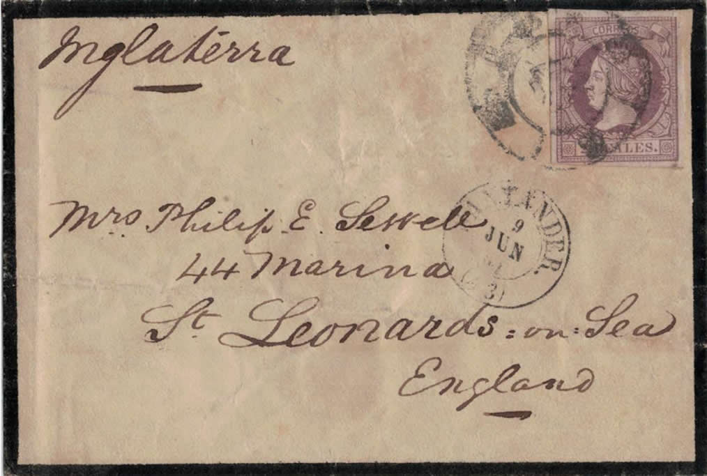 Referente al mismo poco hay que decir: Franqueado con 2 reales tarifa a Inglaterra, sello inutilizado con RC 43 de Santander y en el frente fechador mod. 1857 Santander 9-JUN- 61 (43).