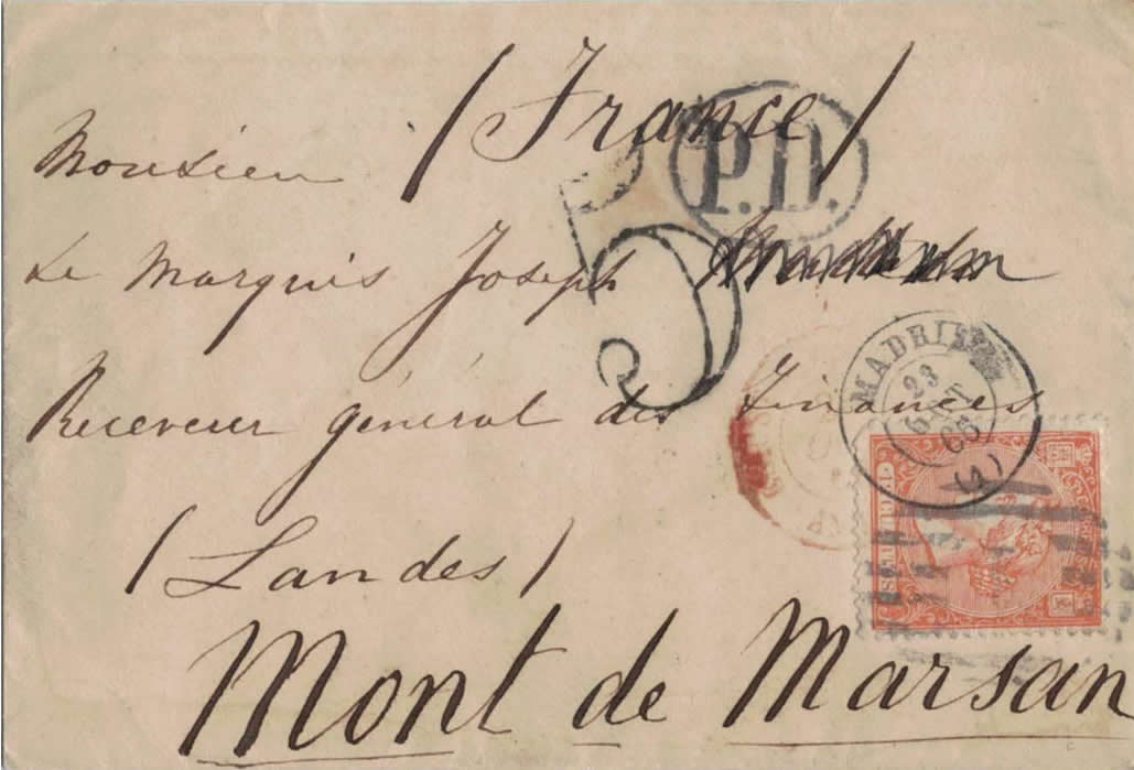 Como comentaba en un anterior mensaje el periodo 1870-1875 es complejo. Por ejemplo tenemos la emisión de Amadeo I cuyo periodo de vigencia fue 1/11/1872 a 30/6/1873. Parece ser que fue en esta emisión cuando se empezó a franquear con sellos adhesivos los impresos que se dirigían a Francia. He llegado a esta conclusión comprobando que hay valores inutilizados con matasellos franceses, lo cual no he visto en sellos de la emisión anterior (Efigie alegórica de España).