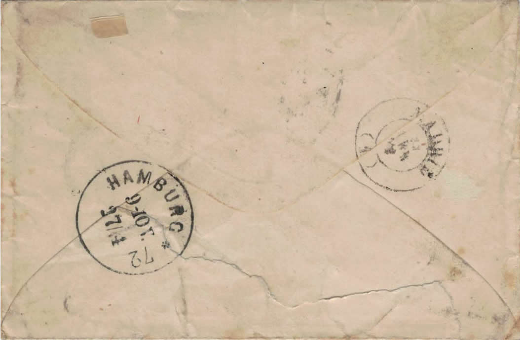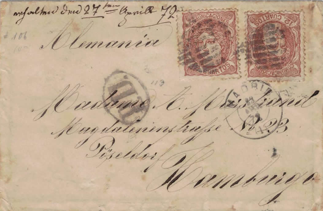 Sobre de tamaño 11 por 7.3 cm. de Madrid a Hamburgo el 23 de abril de 1872. Franqueado con dos sellos de 12 cuartos, tarifa para Alemania. Sellos inutilizados con parrilla limada de Madrid, en el frente fechador mod. 1857, 23-ABR-1872 (1). Al dorso fechador de llegada.