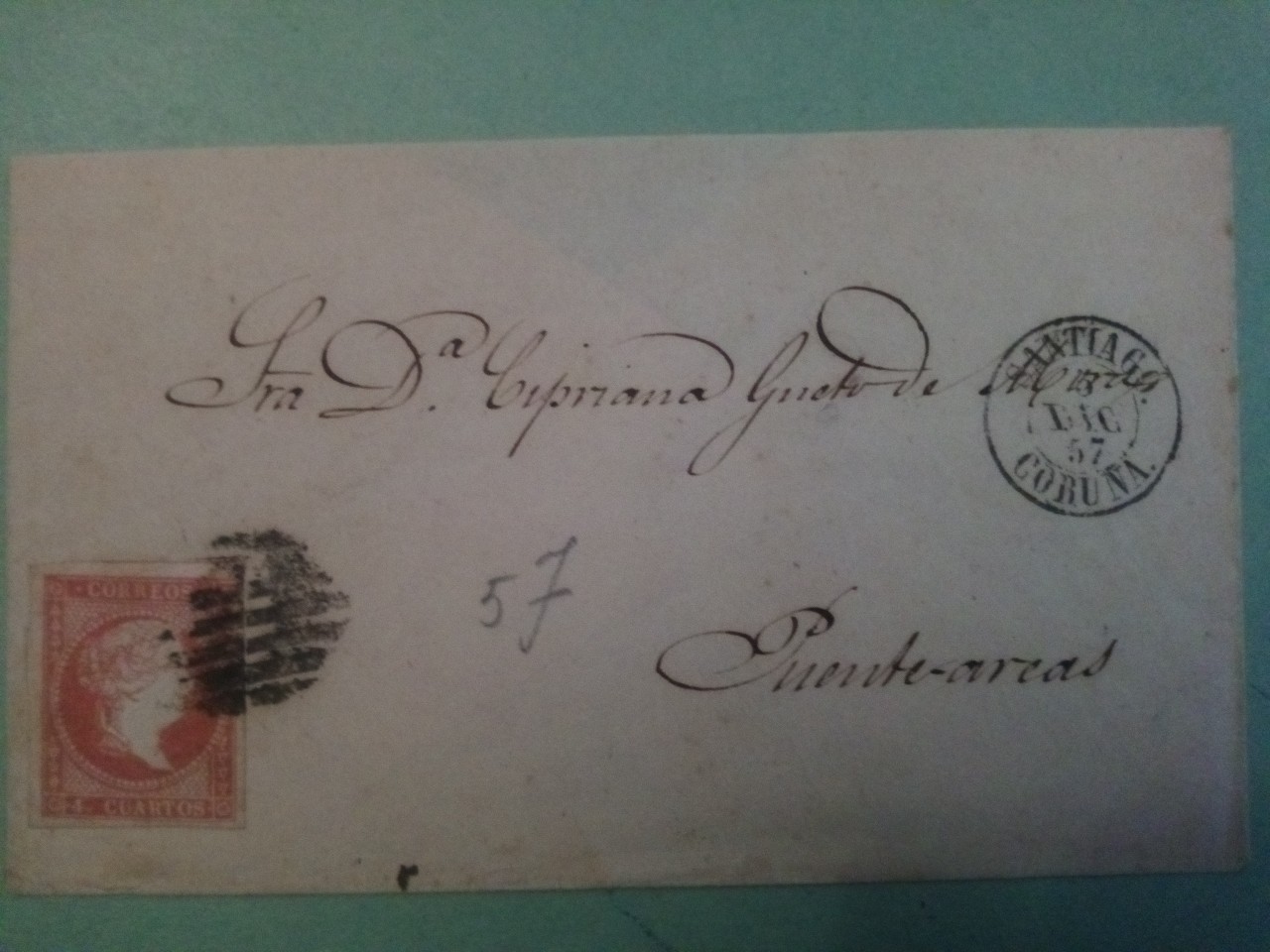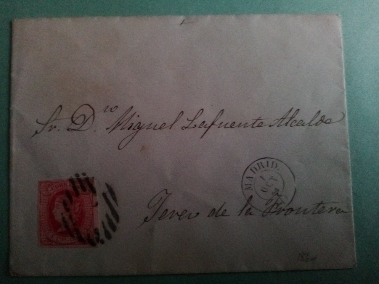 Carta de un porte, sello inutilizado con RC 1 y fechador mod. 1857 MADRID-23-OTC-66 (1).