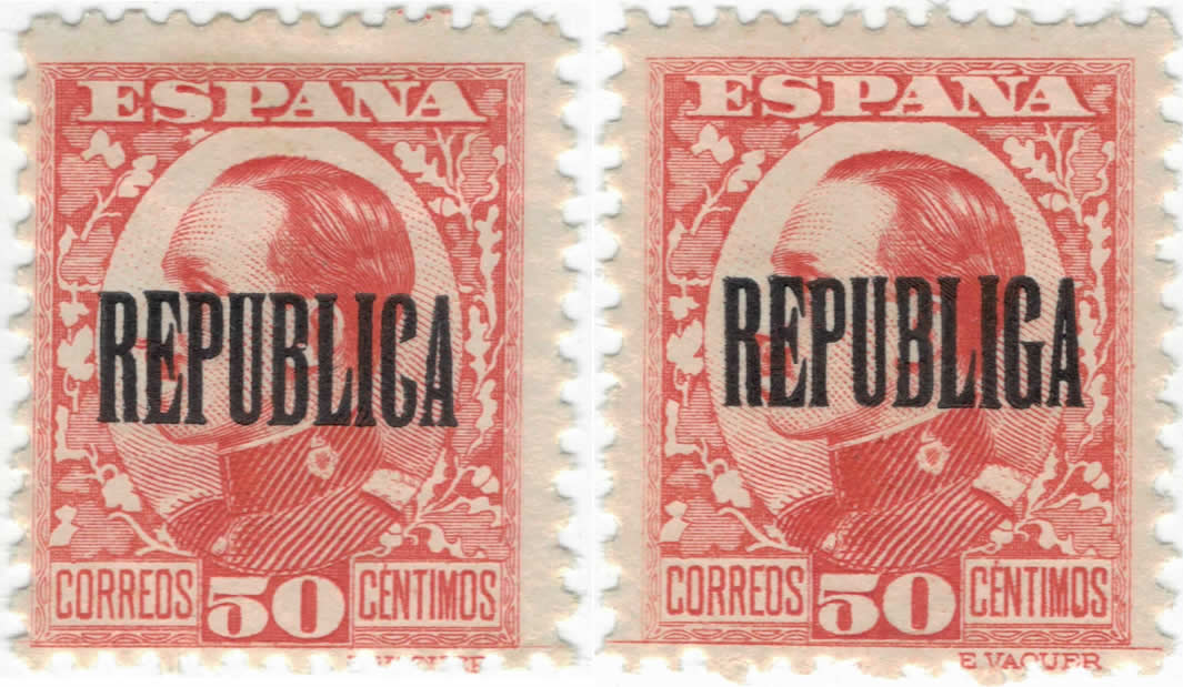 «Se conocen otras sobrecargas republicanas de origen particular de Barcelona, Málaga, Madrid y otras ciudades, algunas de ellas estampadas con tinta de tampón e incluso manuscritas. [sic]».