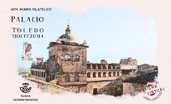 Palacio Toledo-Moctezuma: La imagen de la hermosa cúpula del palacio que en la actualidad acoge al Archivo Histórico Provincial ha sido la imagen elegida para ilustrar esta ATM que se ha diseñado para la EXFILNA 2020. Cáceres, que por la Covid-19 será virtual. Este palacio data de los siglos XIV al XV, aunque las obras principales fueron promovidas durante los siglos XVI al XVII por un nieto de una princesa azteca, Isabel de Moctezuma, casada con un capitán cacereño, Juan Cano Saavedra, que había viajado a América uniéndose allí a las filas de Hernán Cortés.
