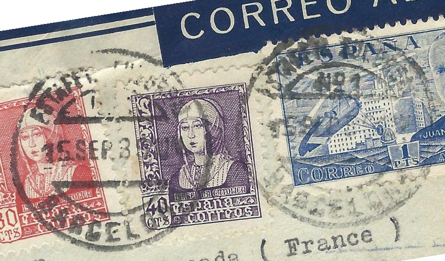 Y otro artículo de Félix Gómez-Guillamón titulado "Un Servicio postal aéreo desconocido a cargo de AIR FRANCE: 'Alcudia-Marsella' (del 5 al 10 de agosto de 1936" donde aparece este ejemplo: